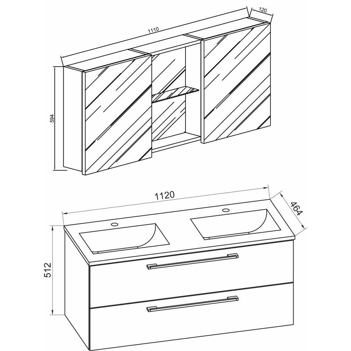 - 1x zrcadlová skříňka se dvěma dvířky, oddělená dvěma viditelnými policemi