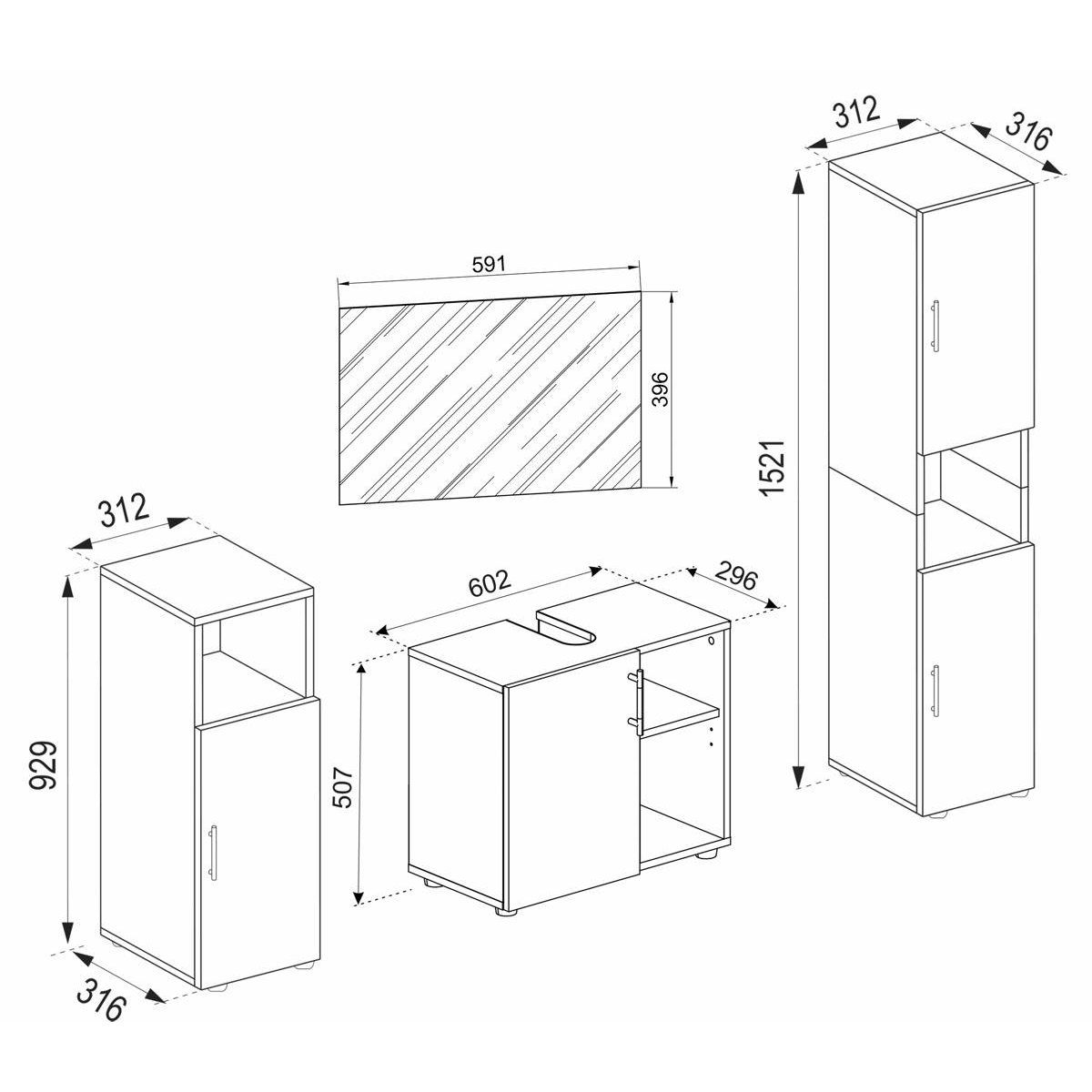 Všechny komponenty sady jsou vyrobeny z melaminového povlaku, který zajišťuje snadné čištění a odolnost vůči vlhkosti, což je ideální pro koupelnové prostředí.
