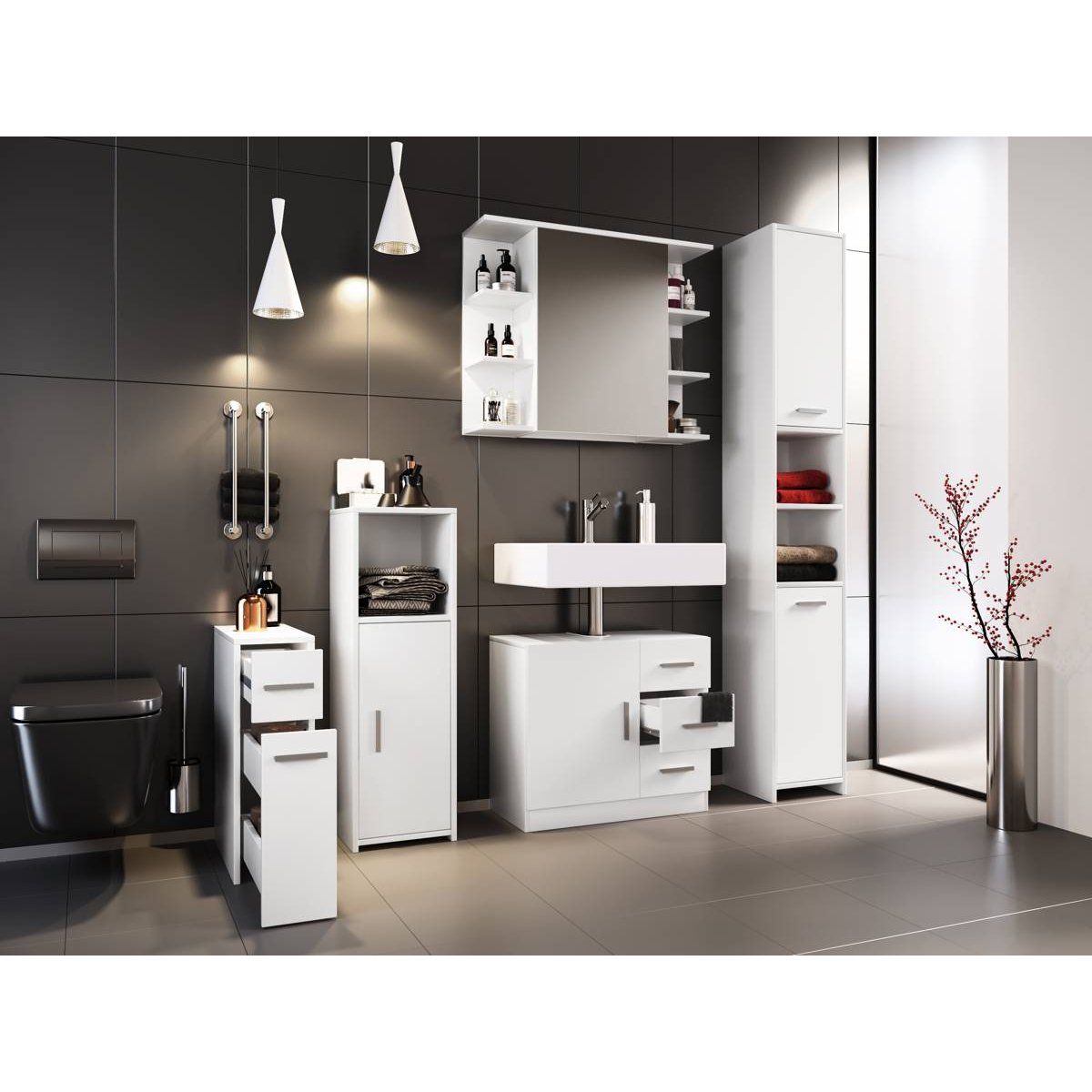 Koupelnová sada VCM "Zalo III" přináší do vaší koupelny nejen styl, ale i praktičnost. Jednoduchý a nadčasový design se hodí téměř do každého interiéru, zatímco melaminový povlak zajišťuje snadnou údržbu a odolnost vůči vlhkosti.