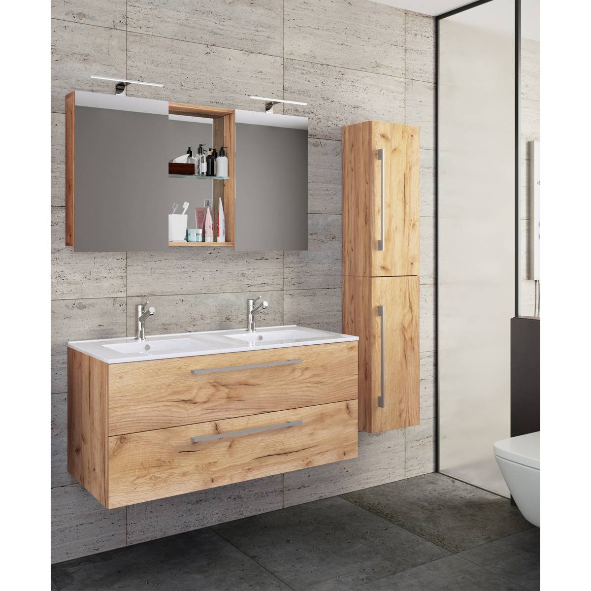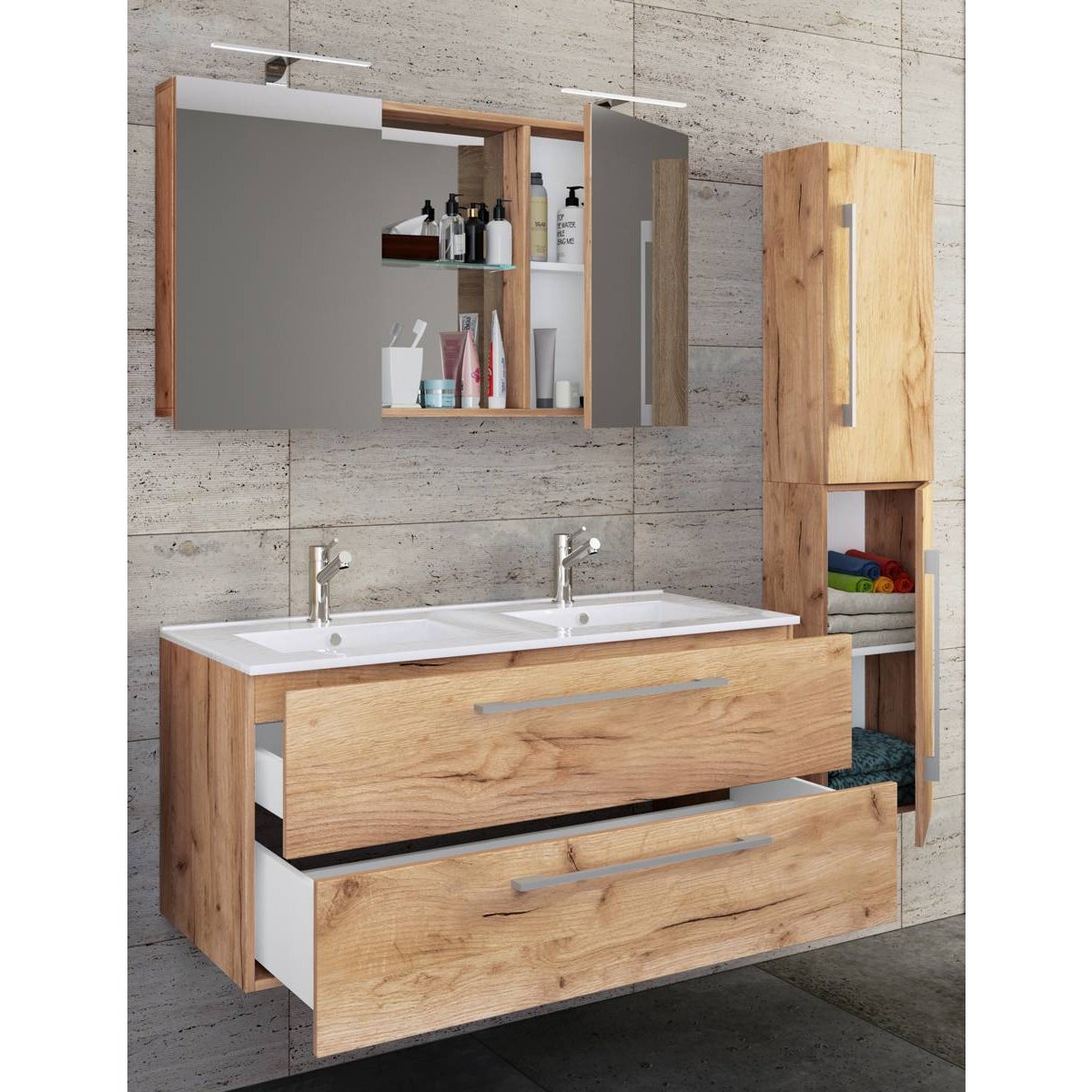 4dílná umyvadlová skříňka Budasi s vysokou skříňkou, dub medový