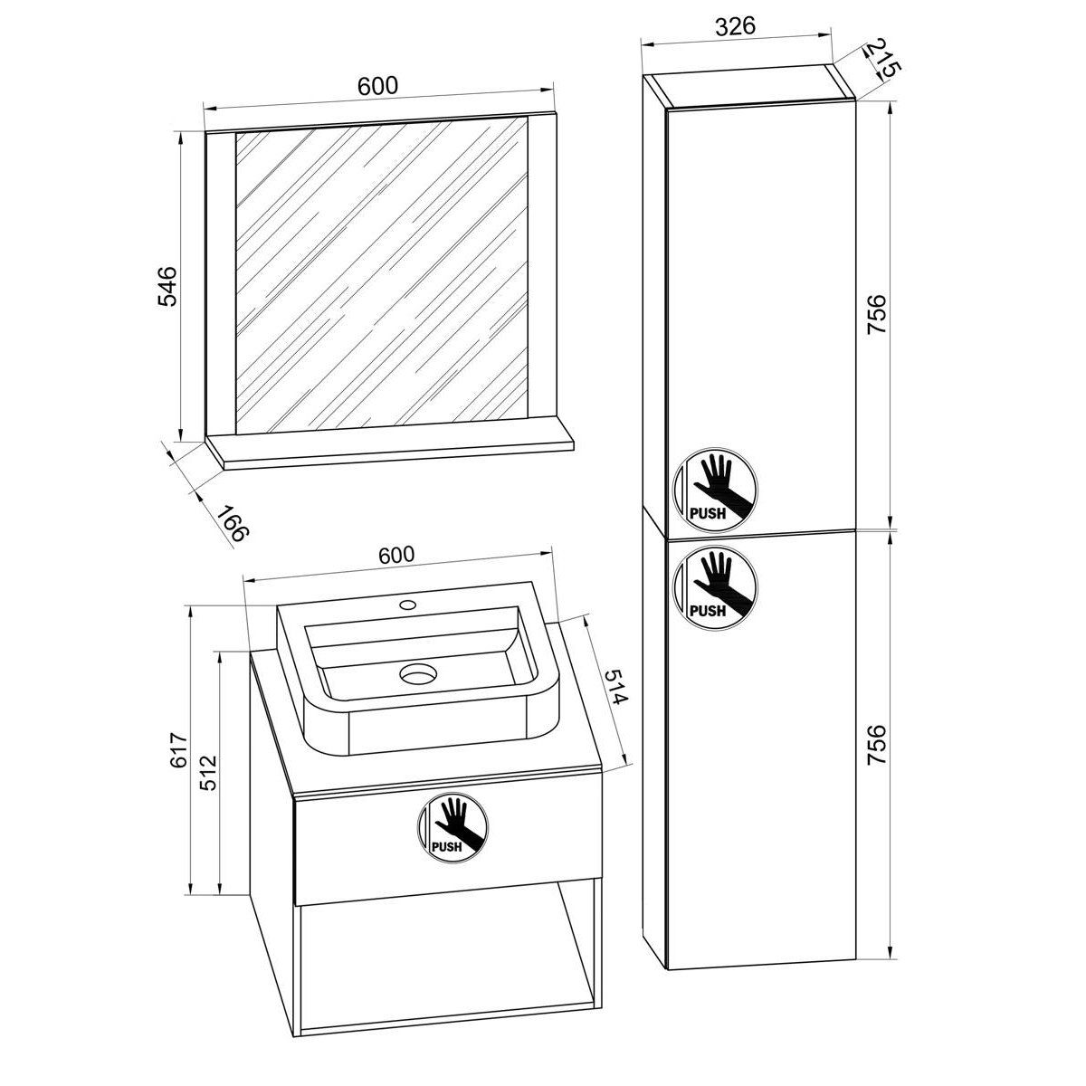 - 1x skříňka pod umyvadlo - Rozměry cca v. 52 x š. 60 x h. 52 cm, jedna zásuvka s funkcí otevírání push-to-open, jedna otevřená přihrádka.
