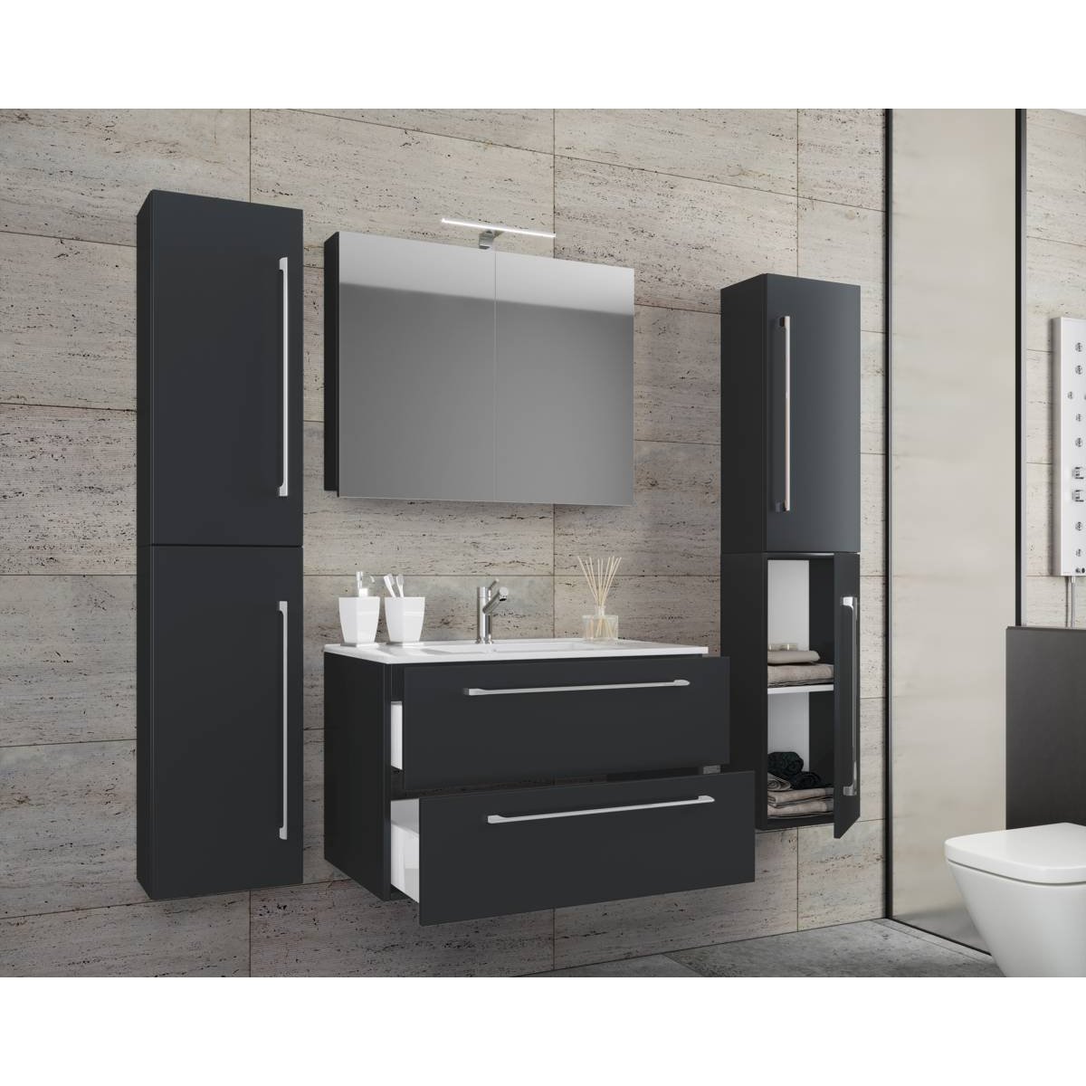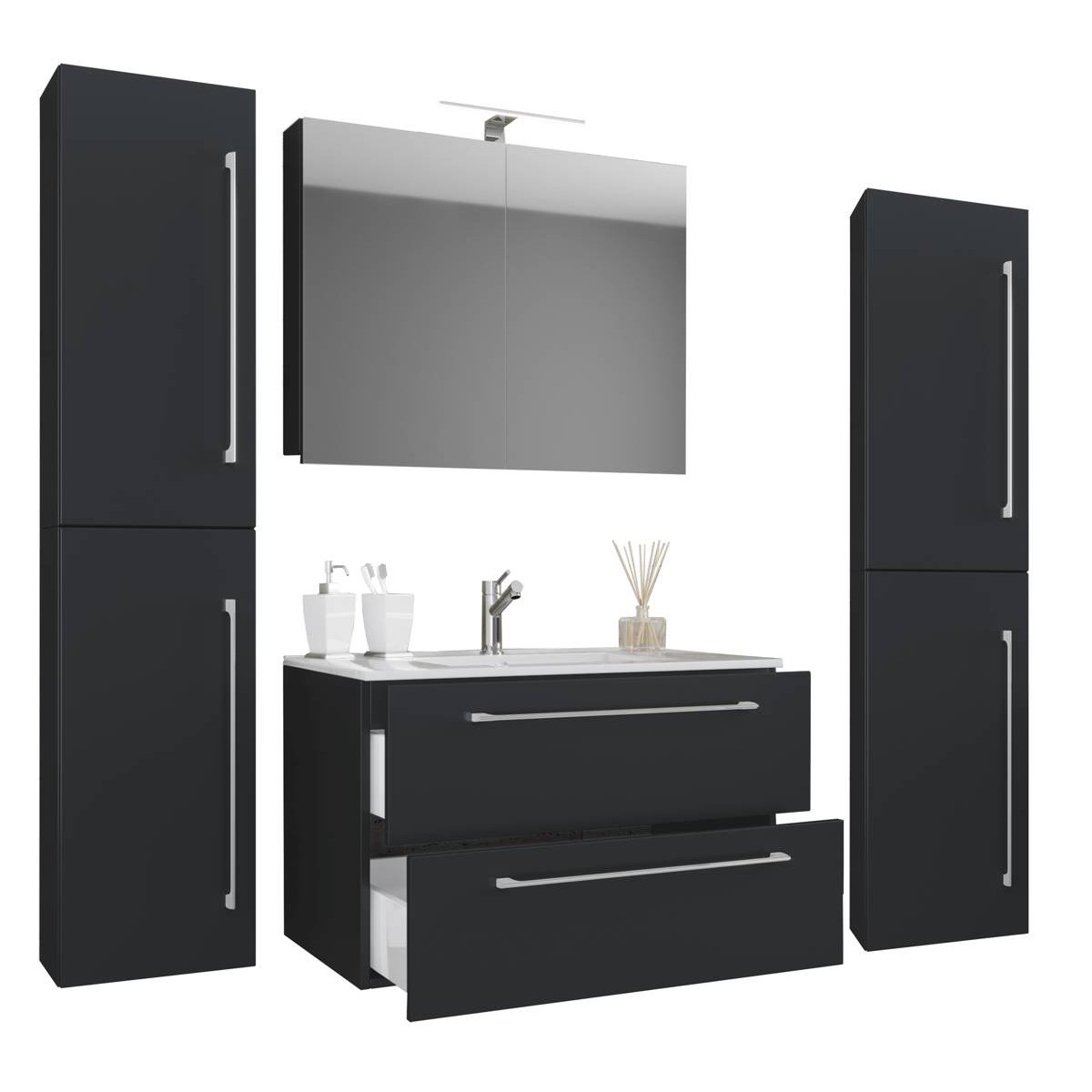 5dílná umyvadlová skříňka Badinos 2 zásuvky 80 cm se zrcadlem a 2 vysokými skříňkami, černá