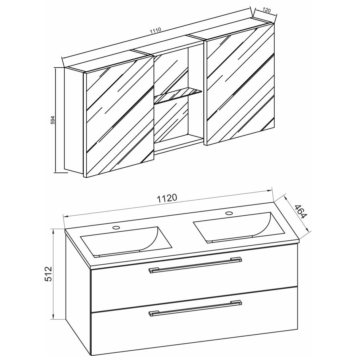 Sada obsahuje: - 1x spodní skříňka se dvěma zásuvkami - 1x dvojité keramické umyvadlo - 1x zrcadlová skříňka se dvěma dvířky, oddělená dvěma viditelnými policemi - 2x vysoká skříňka se dvěma dvířky a čtyřmi policemi Sada koupelnového nábytku se skládá ze spodní skříňky se dvěma zásuvkami na stabilních kovových kolejnicích, zrcadlové skříňky se dvěma dvířky a dvou vysokých skříněk se dvěma dvířky a čtyřmi přihrádkami. Poutavým prvkem je moderní dvojité umyvadlo z masivní keramiky, které dodá vaší koupelně velmi výjimečnou atmosféru. Skříňka pod umyvadlo - rozměry cca v. 51 x š. 111 x h. 46 cm - Korpus s robustním a necitlivým melaminovým povlakem - Dvě velké zásuvky s odolnými kovovými úchytkami Dvojité umyvadlo: - Rozměry cca v. 17 x š. 110 x h. 46 cm - Vyrobeno z robustní keramiky Zrcadlová skříňka: - Rozměry cca v. 59 x š. 112 cm h. 12 cm - Šest polic pro dokonalý pořádek - Vyrobeno z bezpečnostního skla ESG Vysoká skříňka: - Rozměry cca v. 150 x š. 33 x h. 22 cm - Dvě police pro rozdělení prostoru Důraz na detail dělá z koupelnového nábytku VCM něco velmi speciálního. Umyvadlo lze kombinovat s dalším nábytkem ze série „VCM Budasi“. VCM se specializuje na design, výrobu a distribuci nábytku s férovým poměrem cena/výkon od 70. let a již ozdobil miliony domácností.Doplňkové parametry