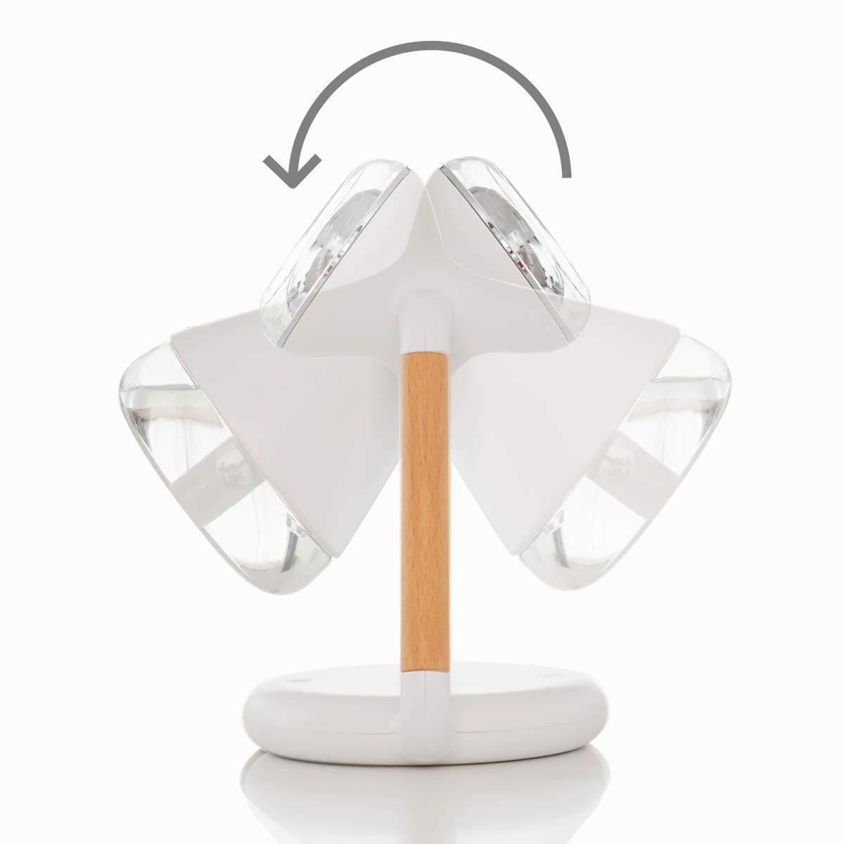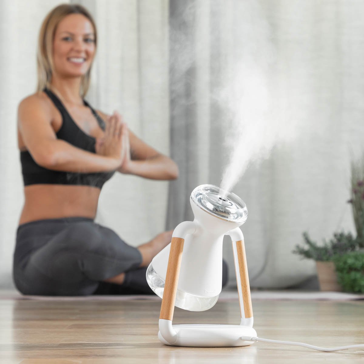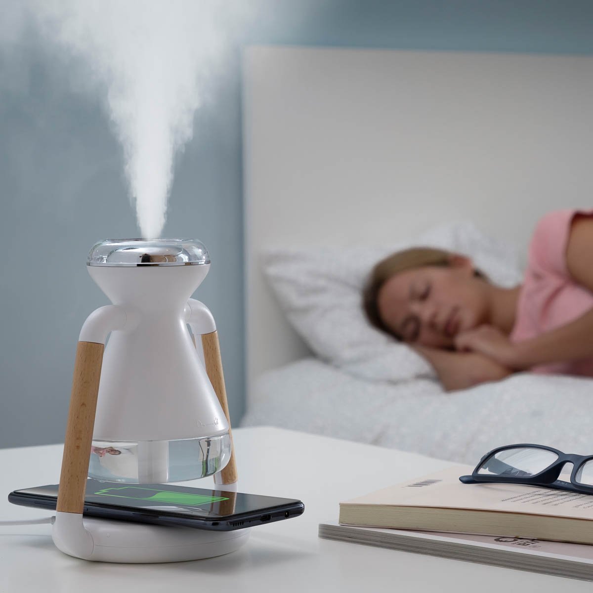 Originální zvlhčovač vzduchu a mobilní stojan s rychlým bezdrátovým nabíjením. Díky dekorativnímu, kompaktnímu a tichému designu je ideální do domácnosti nebo kanceláře. Do nádržky lze také přidávat kapky esencí a vytvořit z něj aroma difuzér. Má tlačítko zapnutí/vypnutí, nádržku o objemu 230 ml, automatické vypnutí po 4 hodinách a LED kontrolky indikující připojení a bezdrátovou nabíječku. Protože je vícepolohový s nastavitelným úhlem až 180º, snadno se také přizpůsobí požadované poloze. Jednoduchý a elegantní způsob, jak si doma nebo v práci užít příjemnější a uvolněnější prostředí. Není dobíjecí, k provozu je třeba jej připojit. Součástí balení je kabel USB na micro USB a náhradní bavlněné válečky.