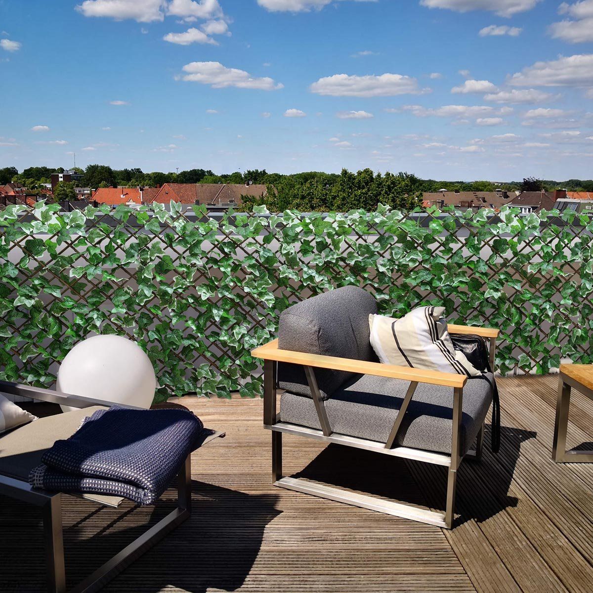 Dekorativní zahradní zástěna na treláži s realistickými listy břečťanu vytváří přirozený vzhled zelené stěny a poskytuje více soukromí na balkoně, terase nebo u plotu. Husté textilní listy břečťanu vytvářejí účinnou clonu na plot a zároveň slouží jako stylová zahradní dekorace nebo mini živý plot.