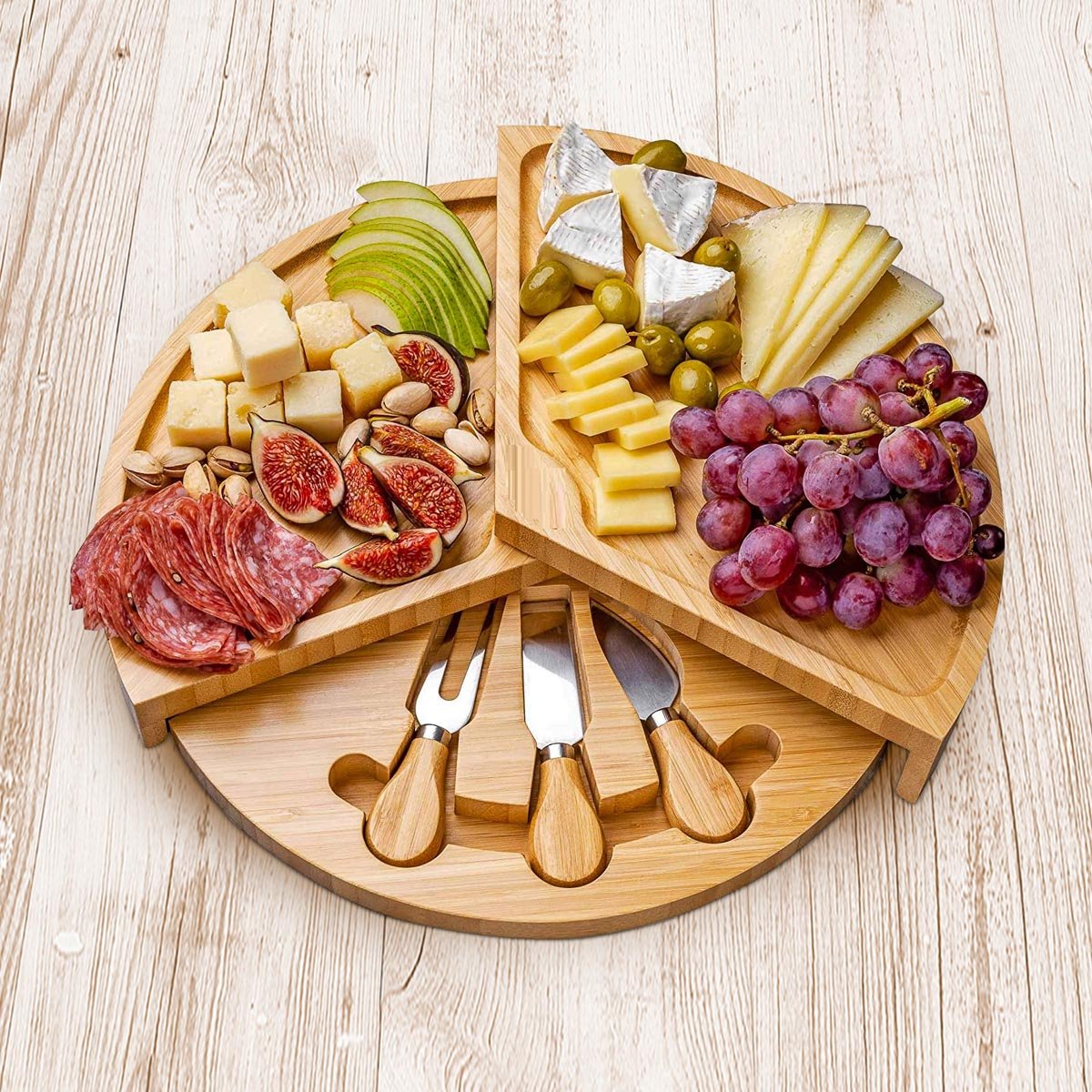 Elegantní bambusový servírovací talíř s integrovanou servírovací vidličkou, mazacím nožem a nožem na sýr. Využijete ho především na praktické a příjemné podávání pohoštění či domácí svačiny i večeře. Tři nastavitelné úrovně lze zasunout do sebe a rozložit podle potřeby a druhu podávaného jídla.