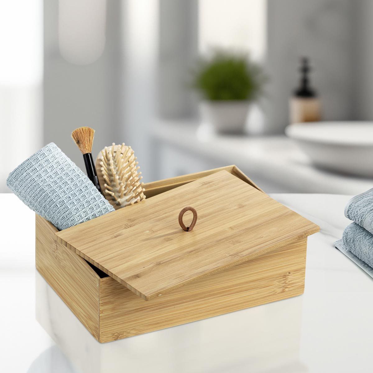 Díky přírodnímu bambusovému provedení působí stylově a přirozeně, takže se hodí do moderních i klasických koupelen. Víko navíc chrání obsah před vlhkostí a nečistotami.