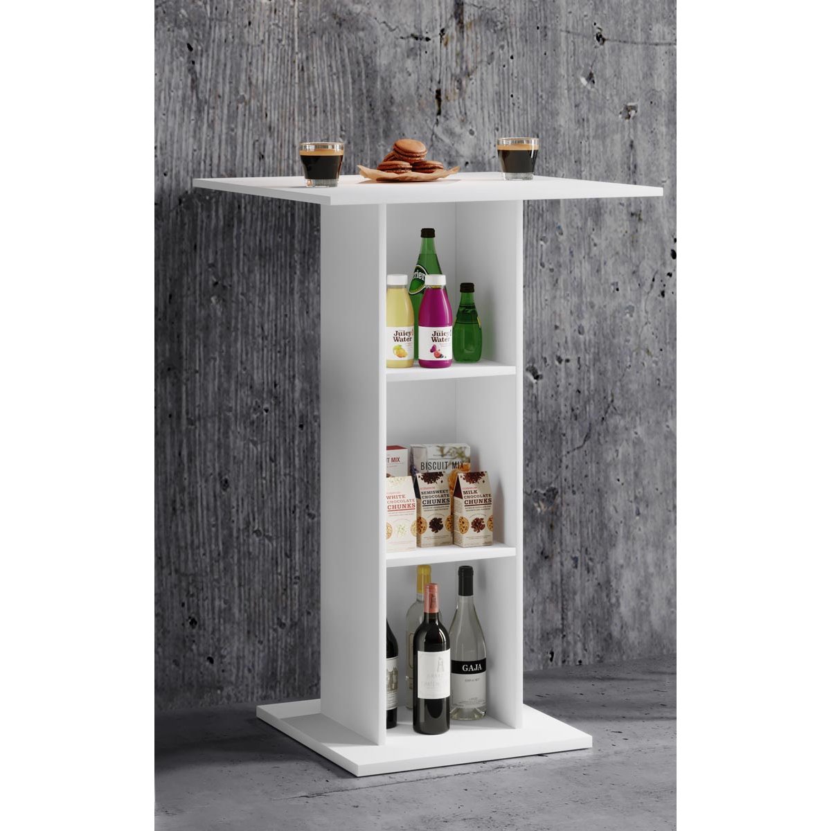 Barový stůl Standos je moderní a funkční kus nábytku, který lze využít nejen jako barový stůl, ale také jako odkládací stolek nebo praktický nábytek do kuchyně. Díky třem policím nabízí dostatek prostoru pro uložení nápojů, kuchyňských doplňků nebo dekorací.