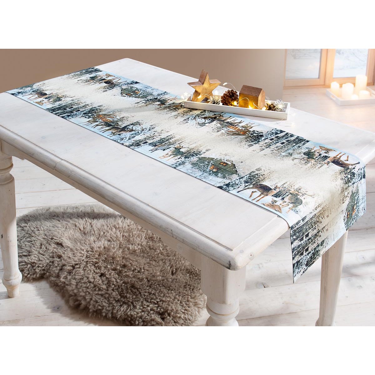 Čistá zimní romantika! Idylický motiv zobrazuje jelení rodinu v zasněženém lese, rustikální dřevěná chata je útulně osvětlena. Tento zimní ubrus čtverec promění váš obyčejný stůl v krásně prostřený během chvilky.
