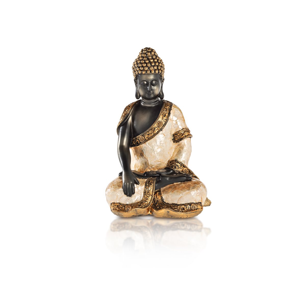 Dekorační soška Buddhy z umělého kamene, s filigránskými detaily, plášť lemovaný plátky z mušlí Capiz.