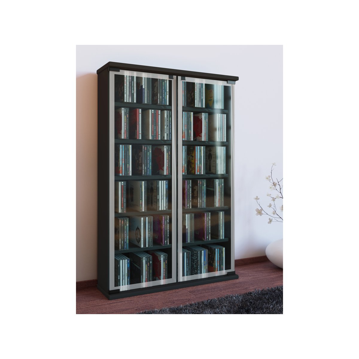 Praktická skříňka Galerie pro odkládání CD, DVD nebo VHS opatřená dvěmi skleněnými dvířky z bezpečnostního skla s okrasným matným okrajem.