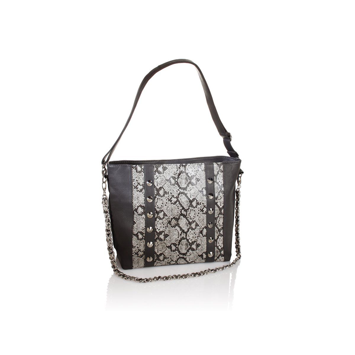 Taška s hadím vzorem, nýty a efektním proplétaným řetízkem.