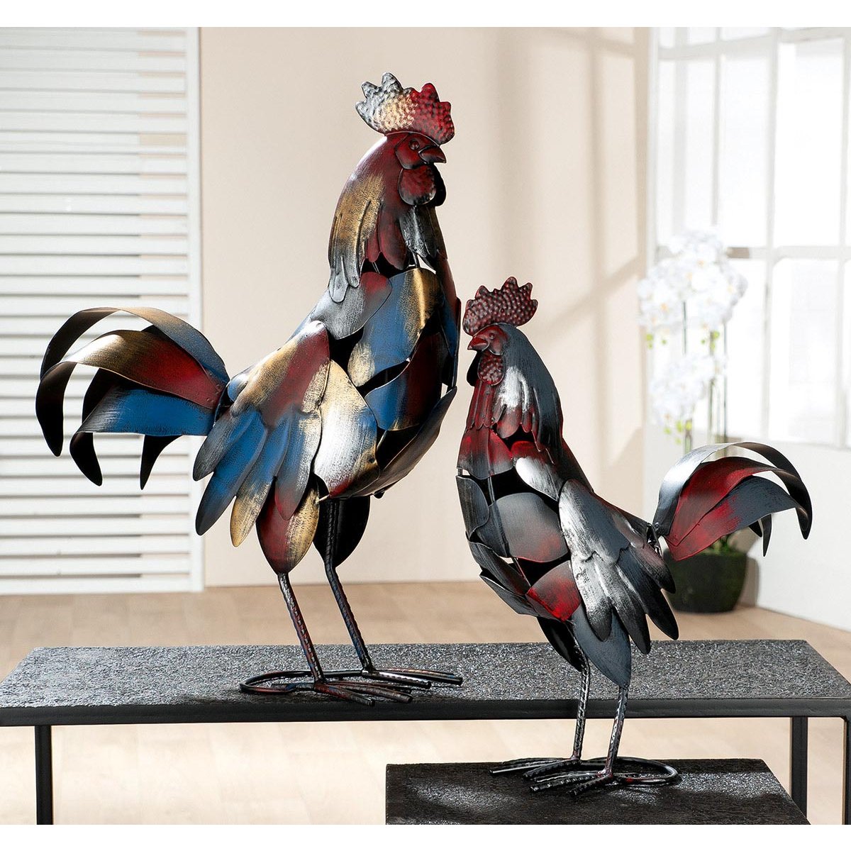 Stylová kovová dekorativní soška ve tvaru kohouta dodá prostoru rustikální a venkovský charakter. Tato výrazná figurka se skvěle hodí jako interiérový doplněk do obývacího pokoje, na poličku či parapet, ale zároveň patří mezi oblíbené sošky na zahradu, kde krásně vynikne na terase, verandě nebo v krytém venkovním prostoru.