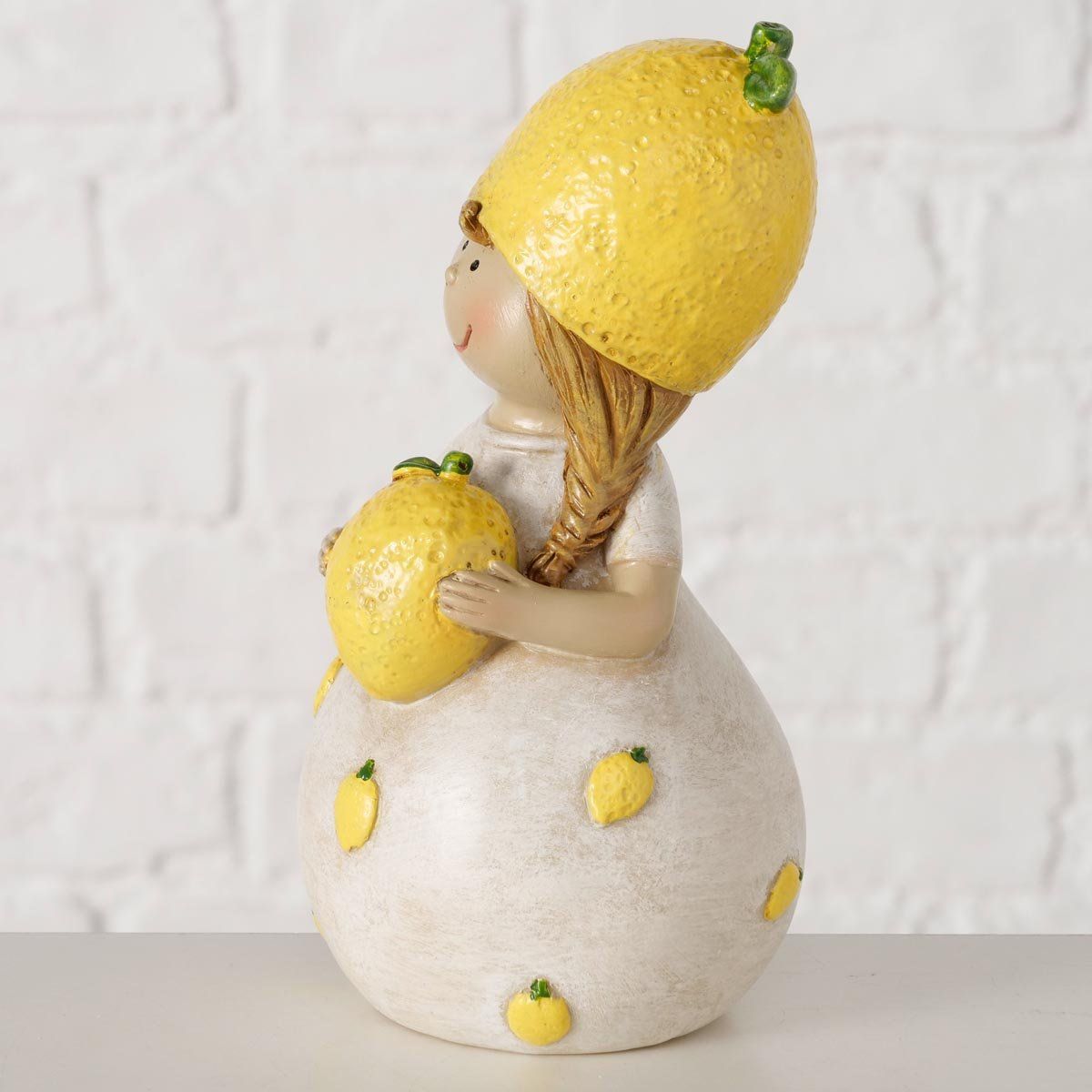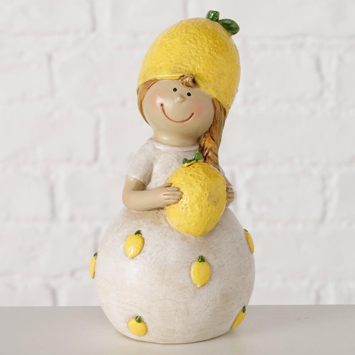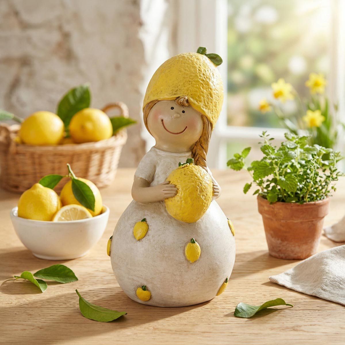 Roztomilá figurka je veselou dekorací, která vnese do interiéru svěžest a hravou atmosféru. Originální postavička s citronovým motivem se skvěle hodí jako jarní dekorace na poličku, komodu, parapet nebo prostřený stůl. Díky jemným detailům a veselému designu oživí každý prostor a potěší milovníky stylových doplňků.