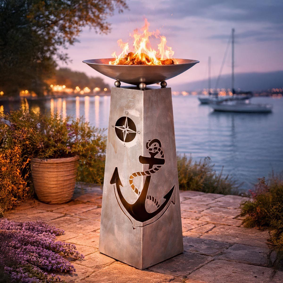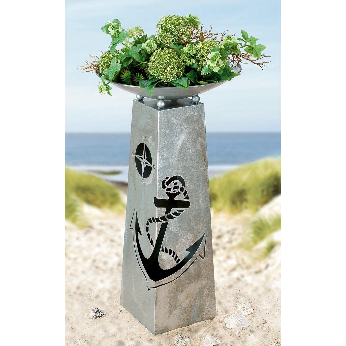 Vneste do svého domova nebo zahrady stylový dekorativní prvek s tímto elegantním kovovým stojanem s miskou. Design s motivem kotvy působí originálně a dodá prostoru jedinečný námořnický charakter. Skvěle poslouží jako námořnická dekorace do interiéru, na terasu i balkon.