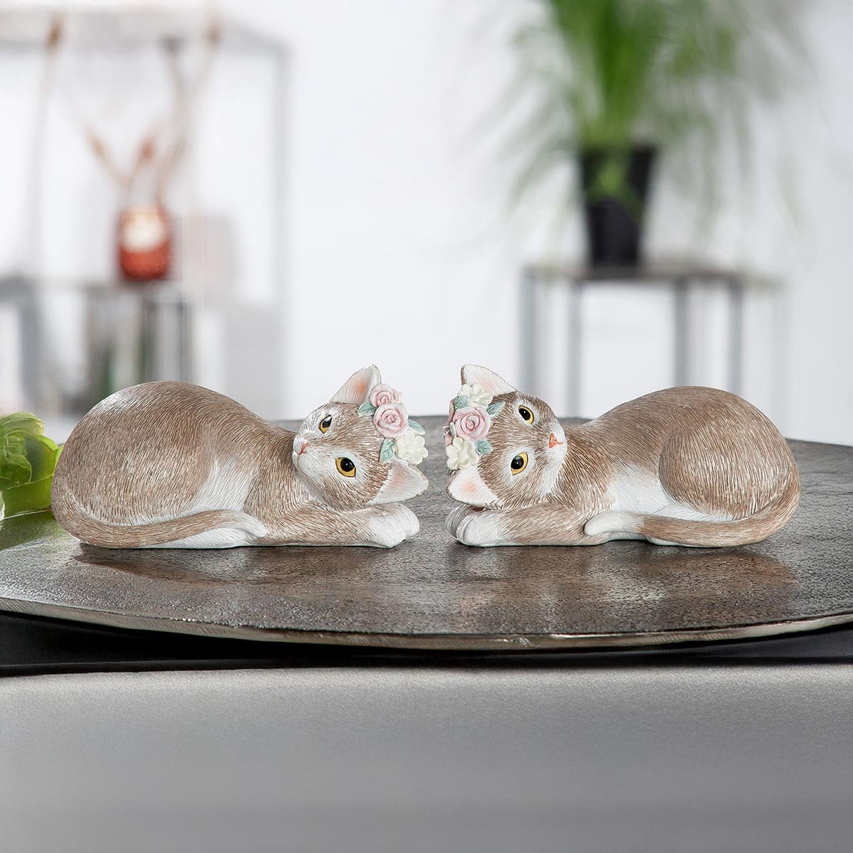 Elegantní dekorace dvou koček vnese do vašeho domova nádech něžnosti a harmonie. Tato dekorativní soška je vyrobena z kvalitní umělé pryskyřice v jemných krémově hnědých tónech. Jedna z kočiček má hlavu ozdobenou květinami, které dodávají celé kompozici romantický vzhled. Ideální jako stylová soška do interiéru na polici, komodu nebo parapet. Skvěle poslouží také jako originální dárek pro milovníky zvířat.