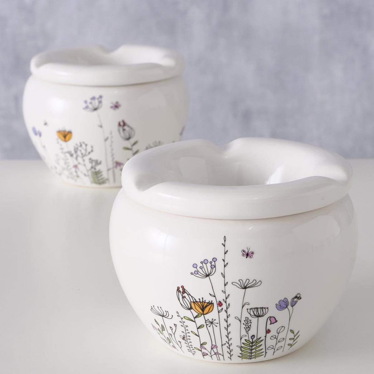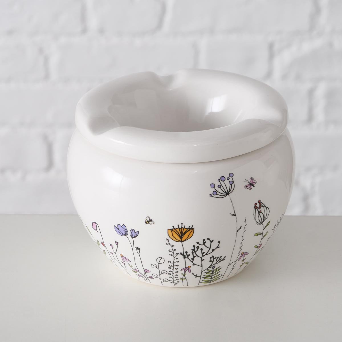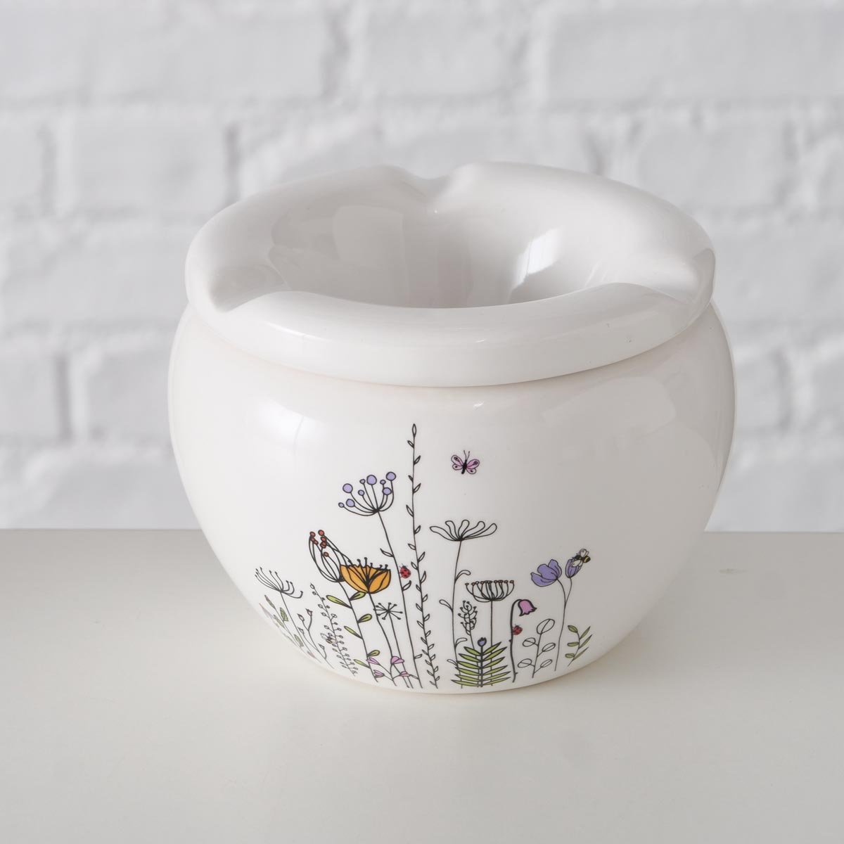 Představujeme vám elegantní popelník Kamilla z glazované keramiky, který je estetickým kouskem díky svému květinovému motivu a pečlivě propracovaným detailům.