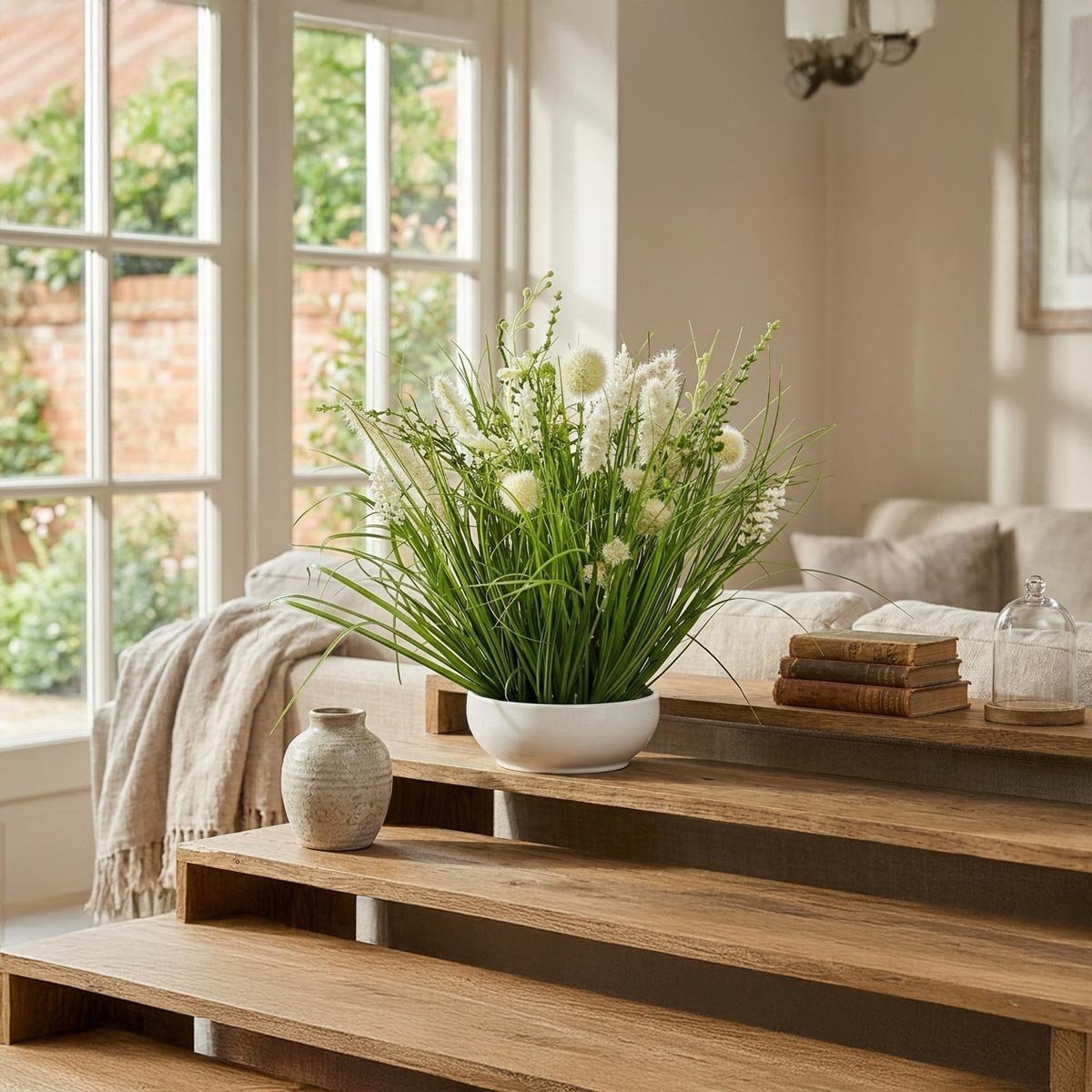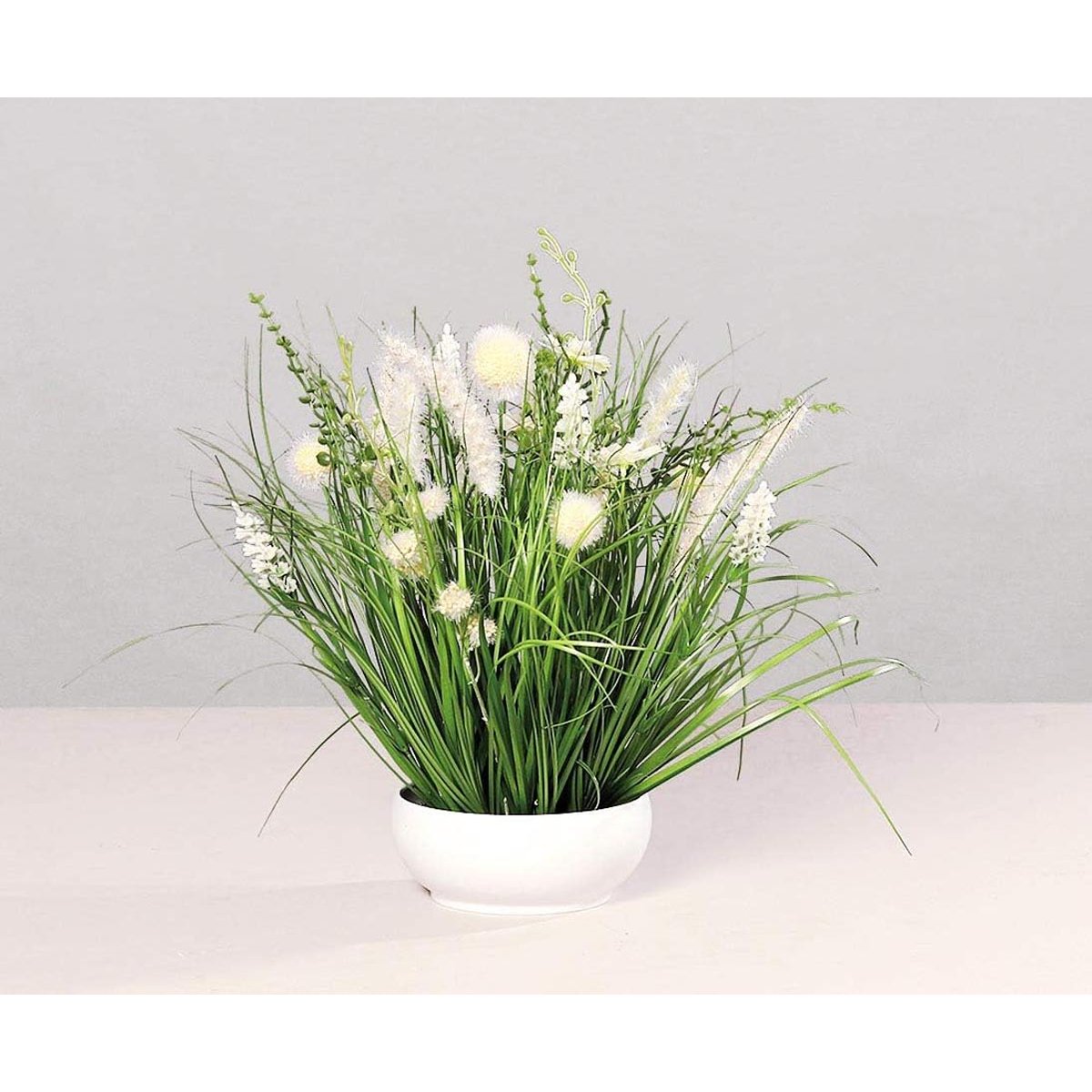 Umělá dekorativní tráva v bílé misce je stylová umělá rostlina, která vnese do vašeho domova svěží zelený akcent bez nutnosti péče. Díky realistickému provedení a elegantní kombinaci zeleně s bílým květináčem působí přirozeně a dekorativně.