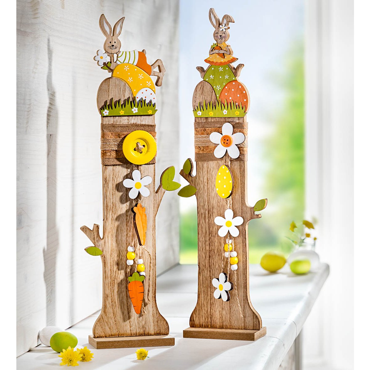 Stojací dřevěná dekorace s velikonočními zajíčky je nepřehlédnutelnou velikonoční výzdobou interiéru. Oba stojany jsou vyrobeny ze dřeva, zajíčci na vrcholu jsou pečlivě ručně malovaní v jarních svěžích barvách.