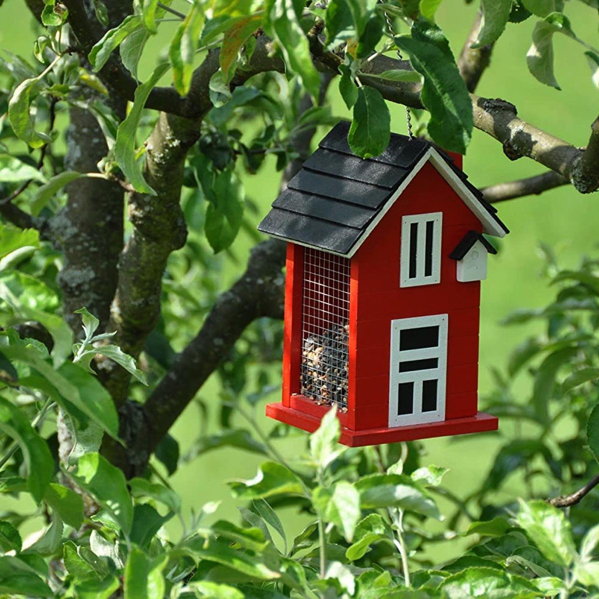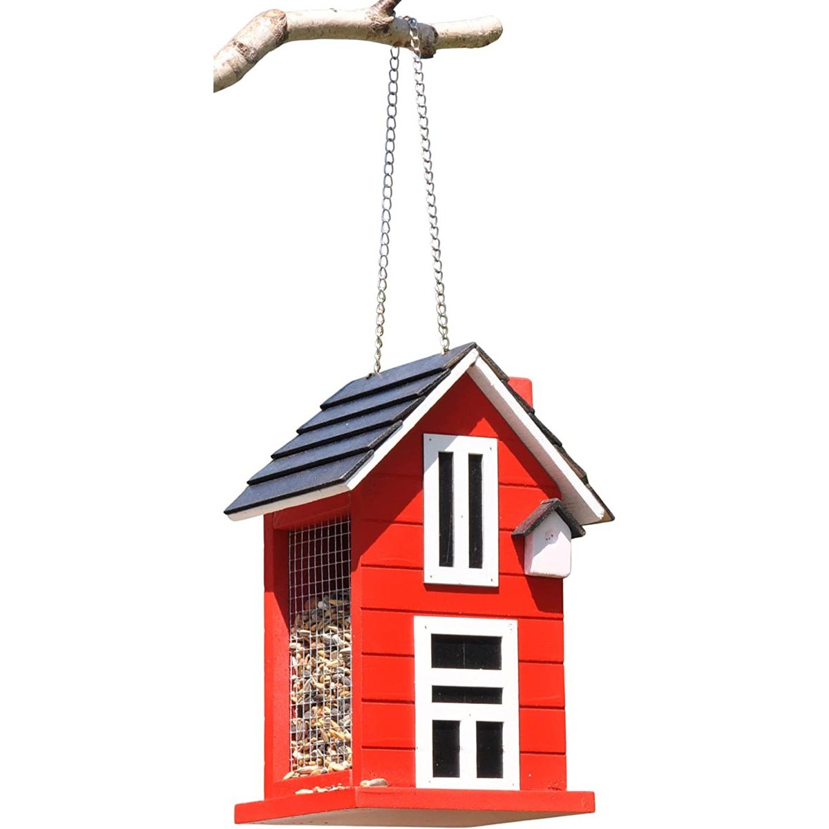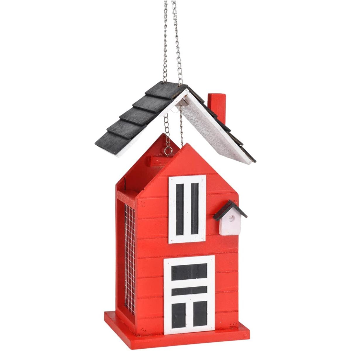 Červený domeček pro ptáčky s mnoha roztomilými detaily. S otvírací střechou lze snadno naplnit krmivem S řetízkem na zavěšení.
