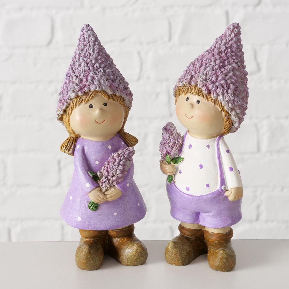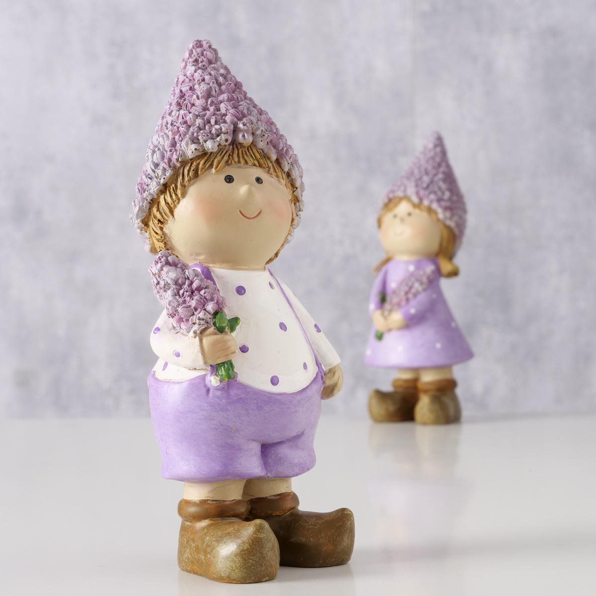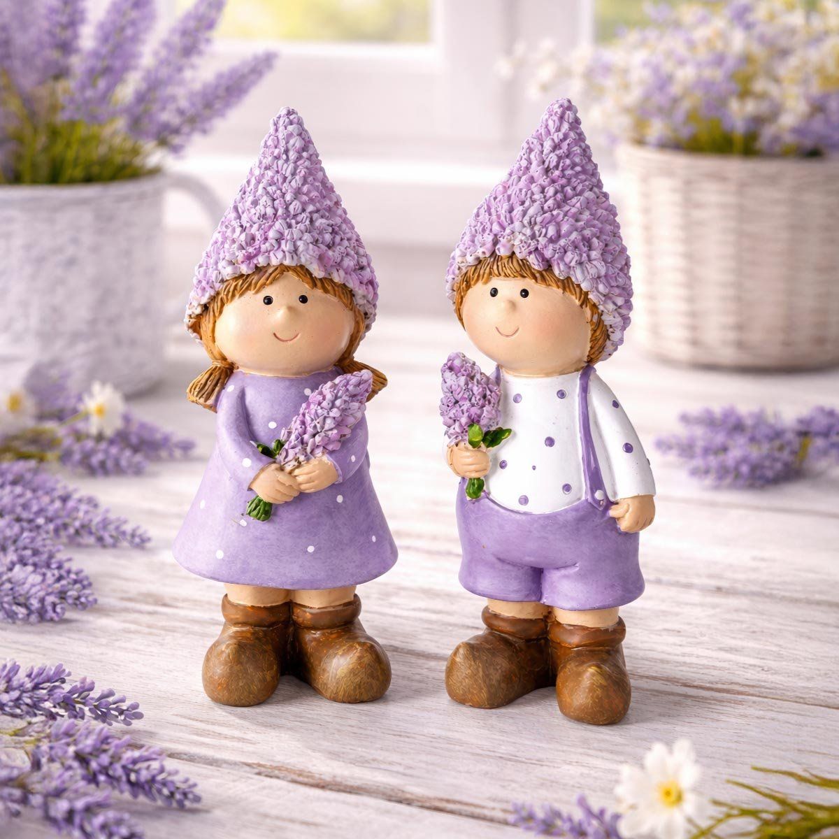 Roztomilá sada 2 dekorativních figurek s motivem levandule vnese do vašeho domova jemnou venkovskou atmosféru a svěží nádech Provence stylu. Veselé postavičky s levandulovými čepičkami a kytičkami v rukou se skvěle hodí jako ozdoba na polici, komodu, parapet nebo stůl. Díky detailnímu zpracování a jemným barvám působí hravě a velmi dekorativně.