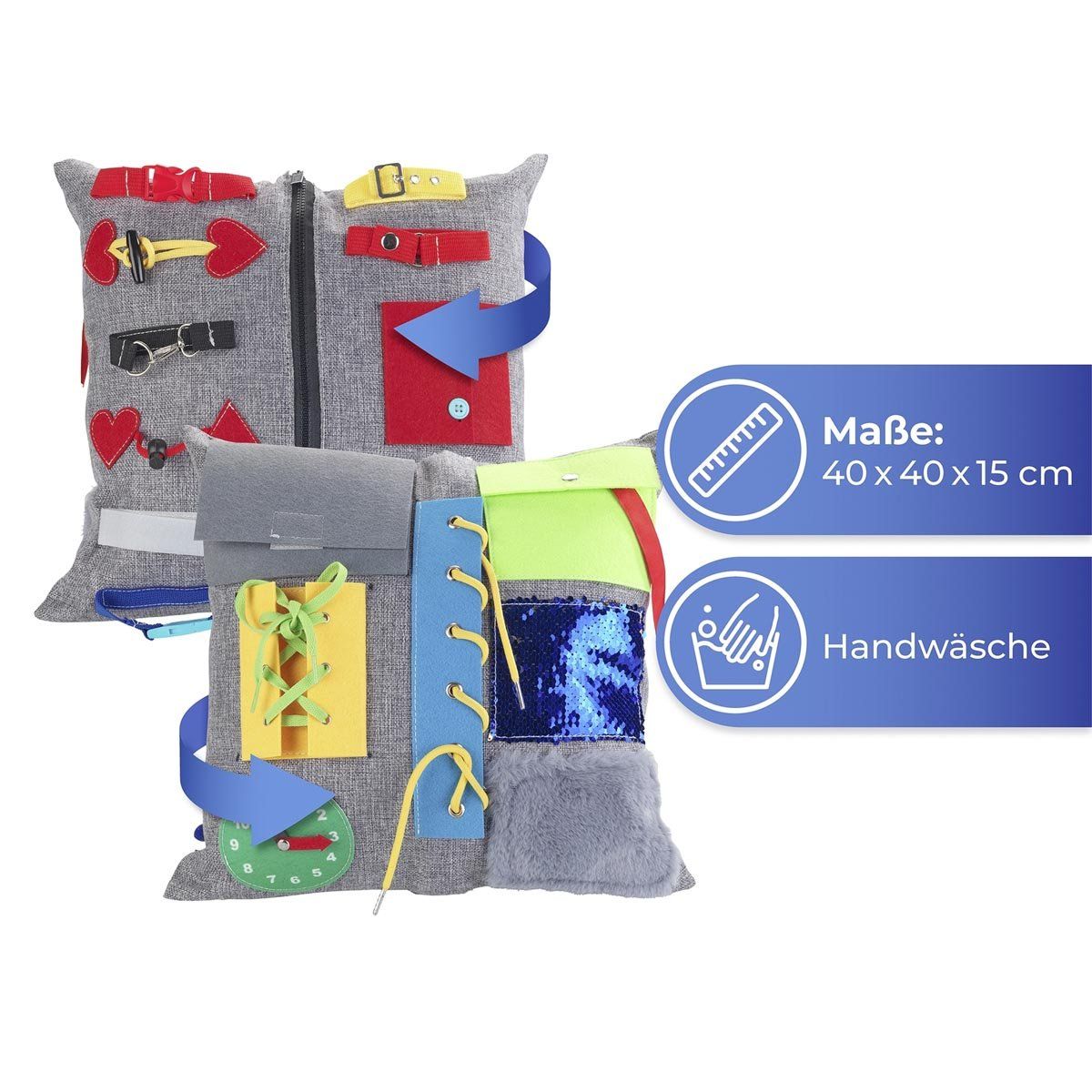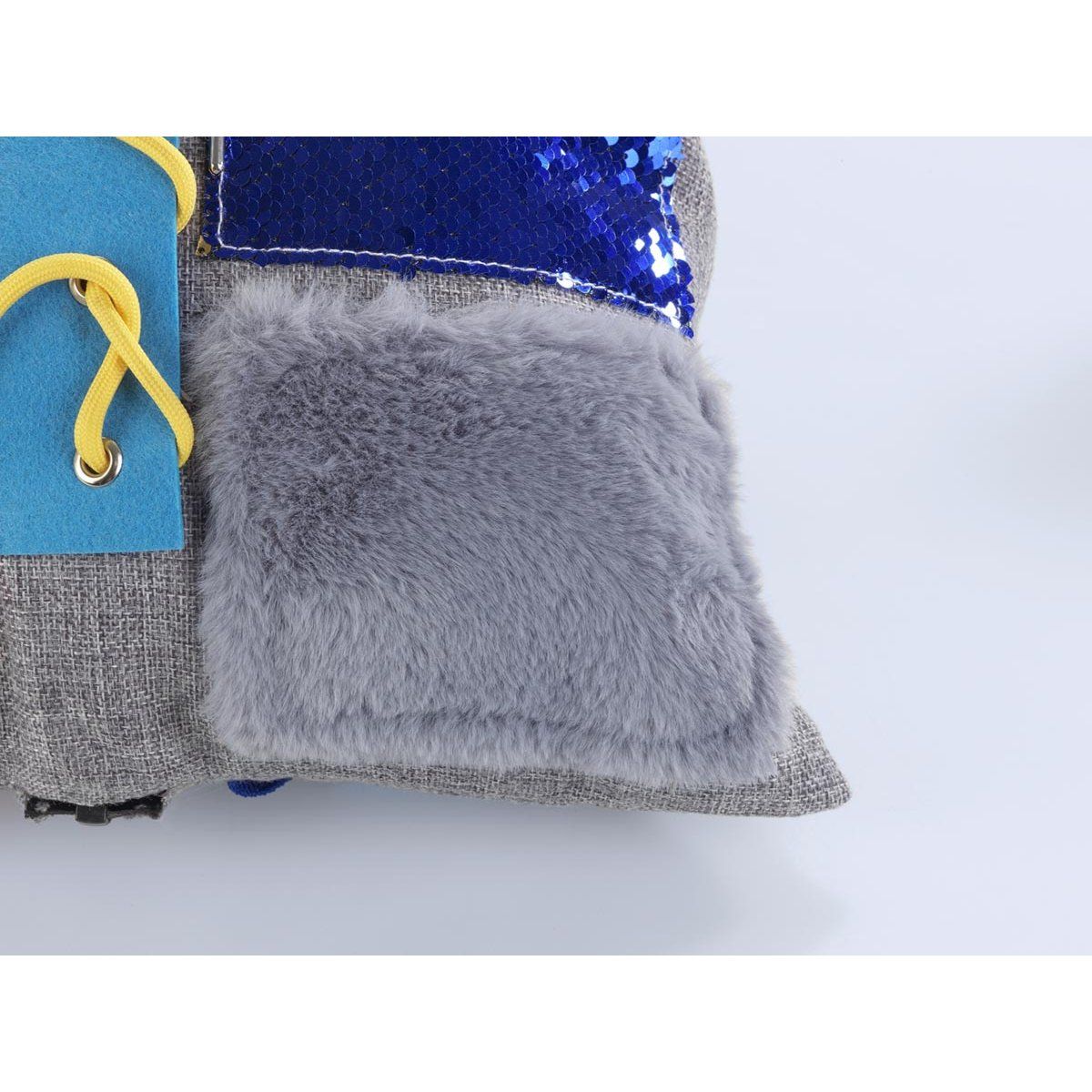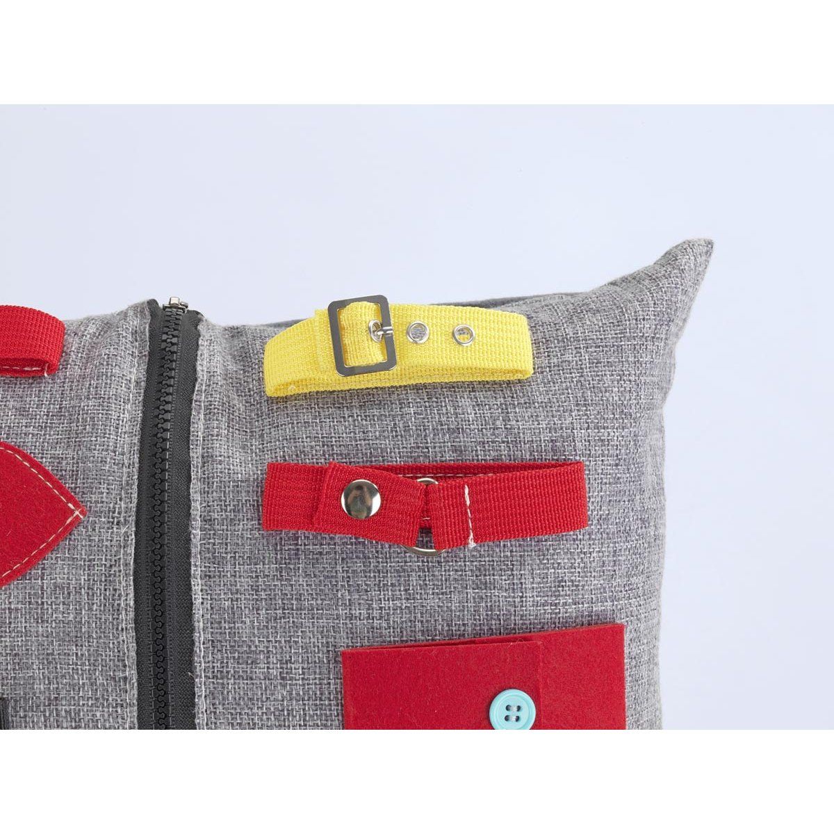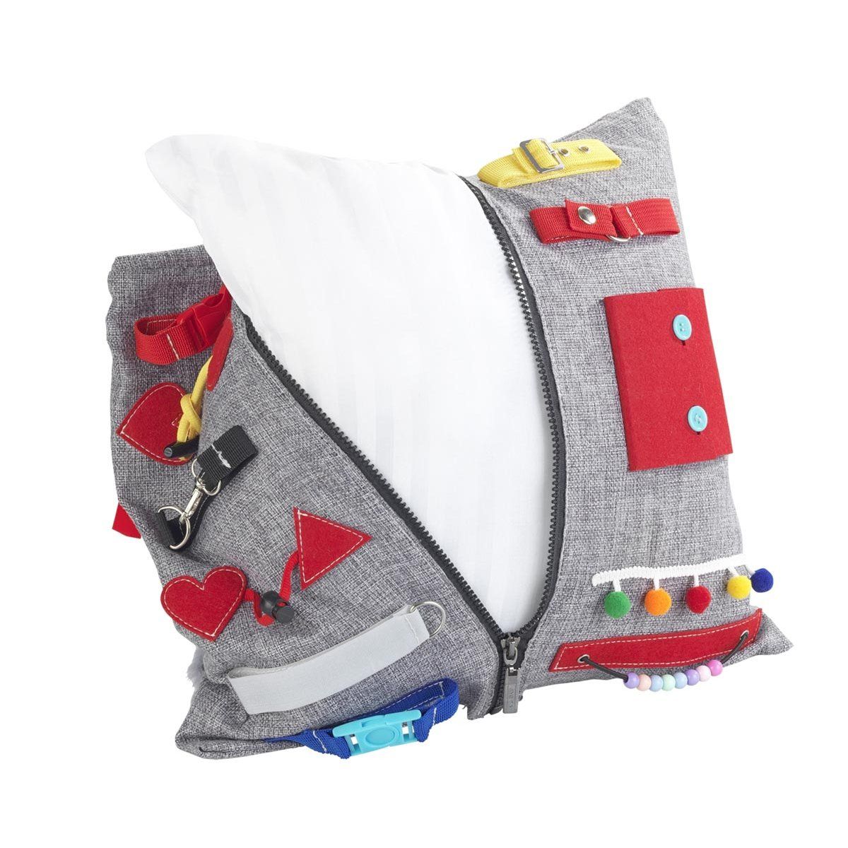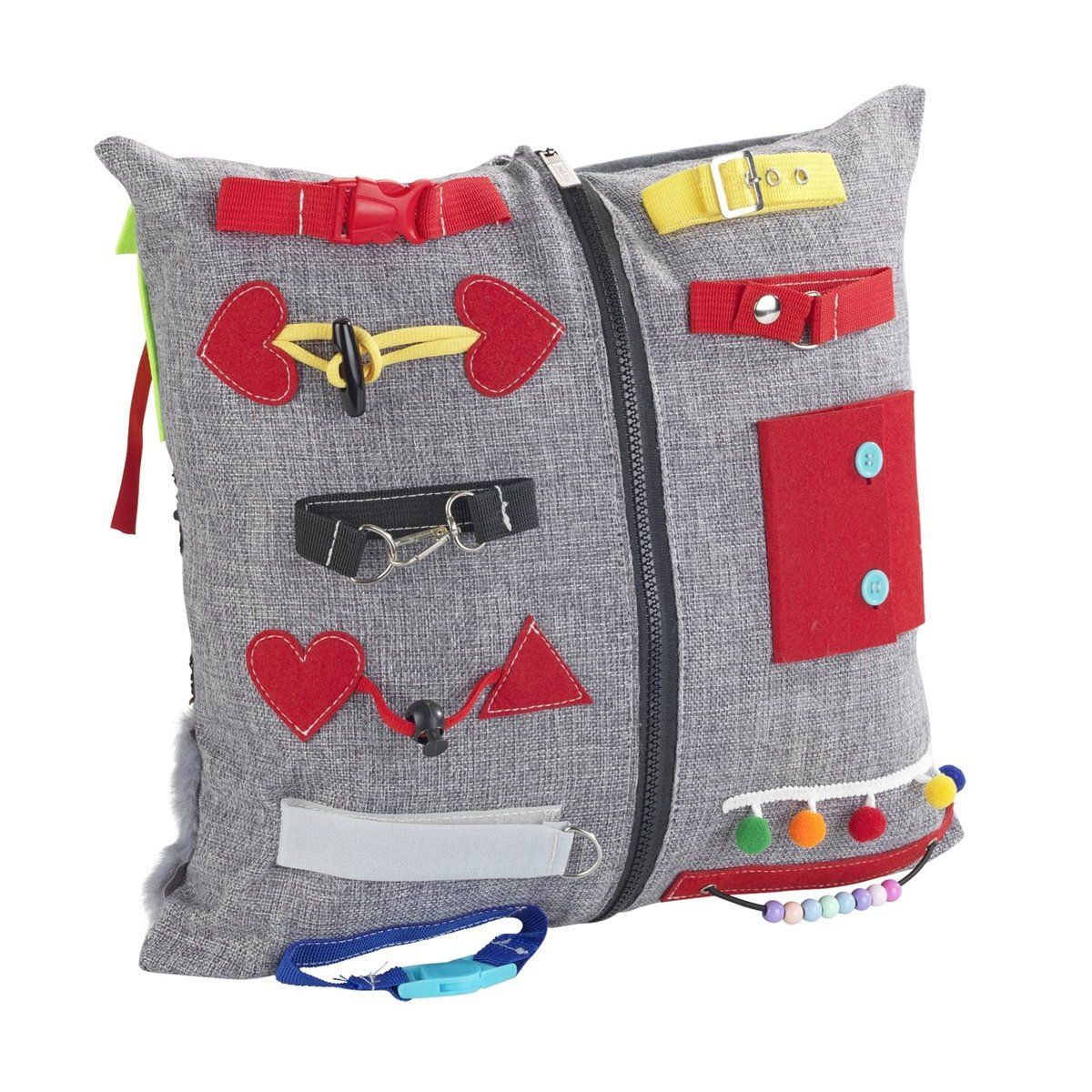 Polštář obsahuje různé interaktivní prvky, jako jsou zipy, knoflíky, pásky či textilní části s odlišnou strukturou. Tyto aktivity podporují motoriku rukou, koordinaci a jemné vnímání. Pravidelné používání může pomoci snížit neklid, stres i úzkost a zároveň přirozeně stimulovat smysly.