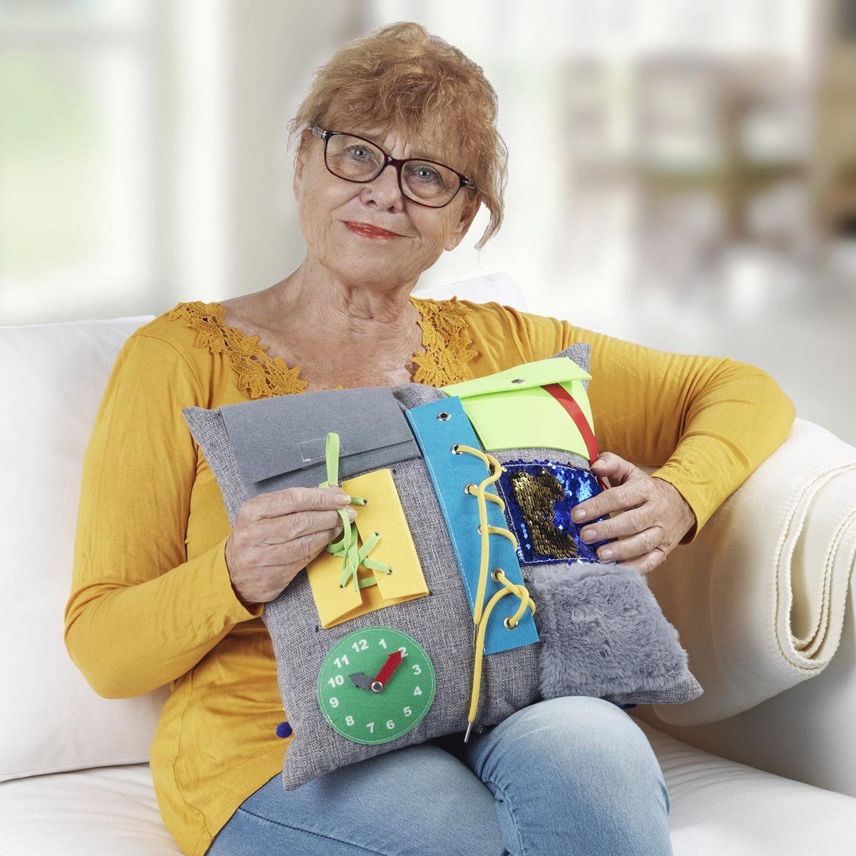 Tento speciální polštář pro neklidné ruce je navržen jako praktická pomůcka pro zklidnění a aktivaci mysli. Ideálně se hodí jako jedna z pomůcek pro seniory s demencí, která pomáhá zaměstnat ruce a přináší pocit jistoty a klidu.