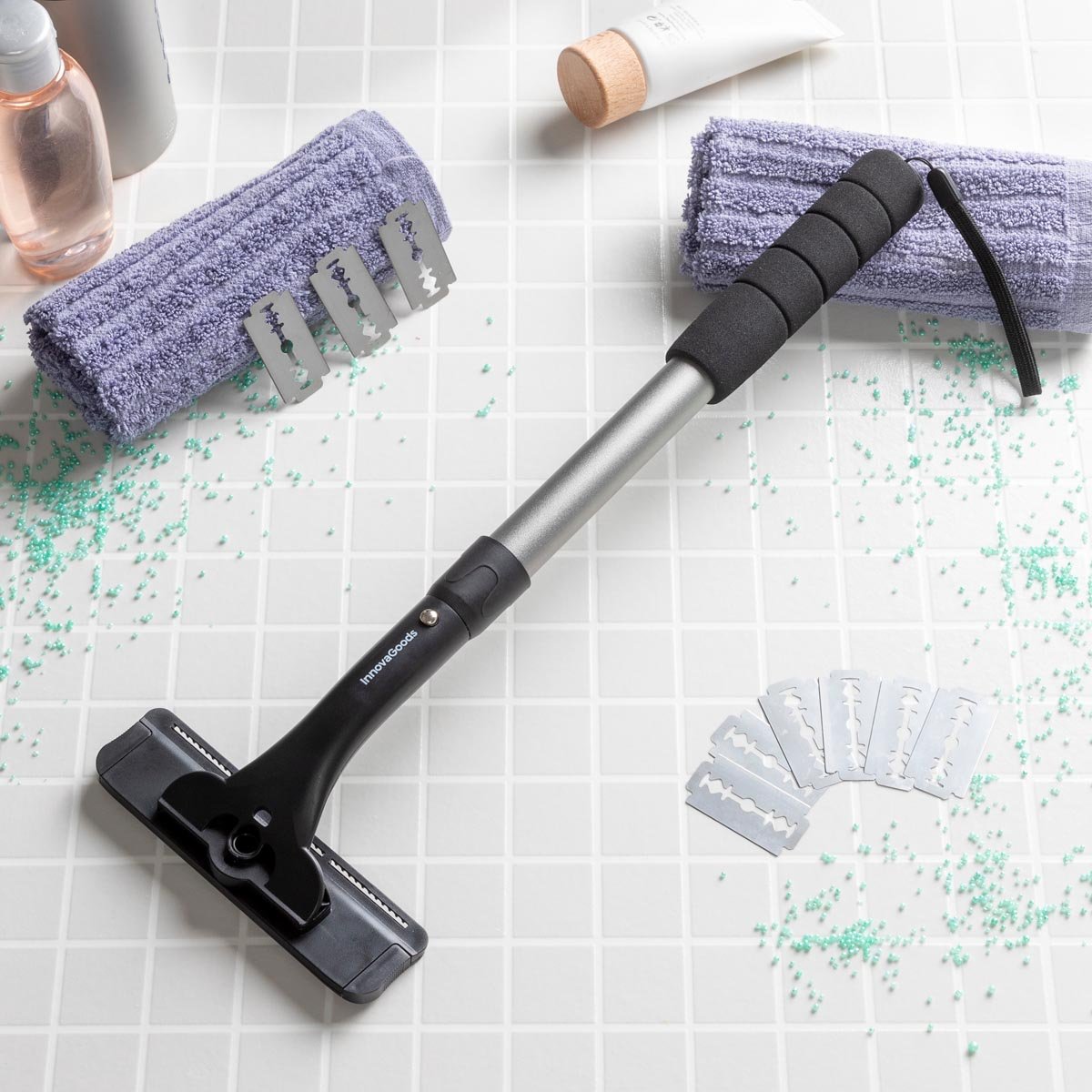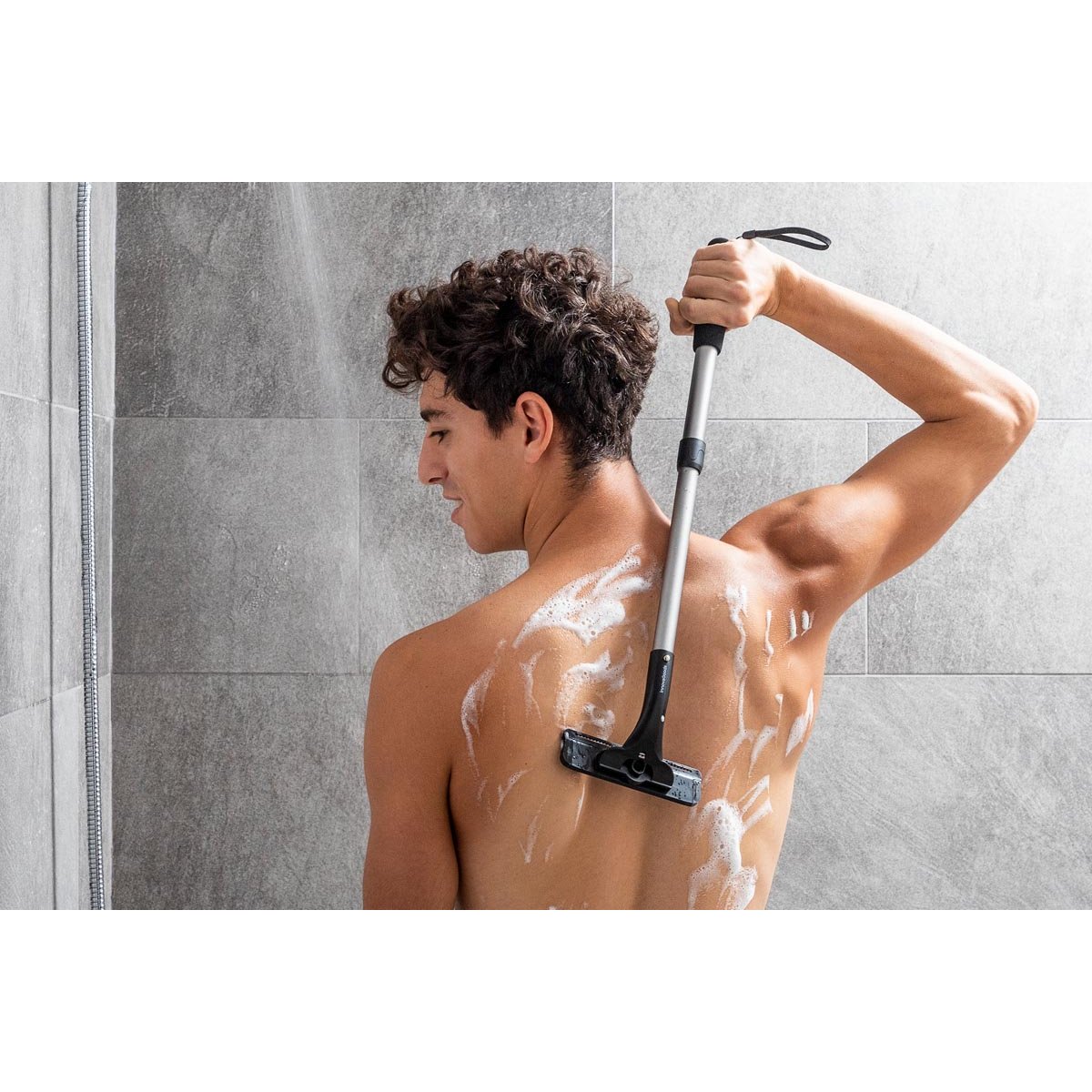 Strojek je díky protiskluzové rukojeti (se šňůrou k zavěšení) pohodlný do ruky a nabízí teleskopickému provedení (36 – 54 cm), takže snadno dosáhnete i na jinak nedostupné partie zad.