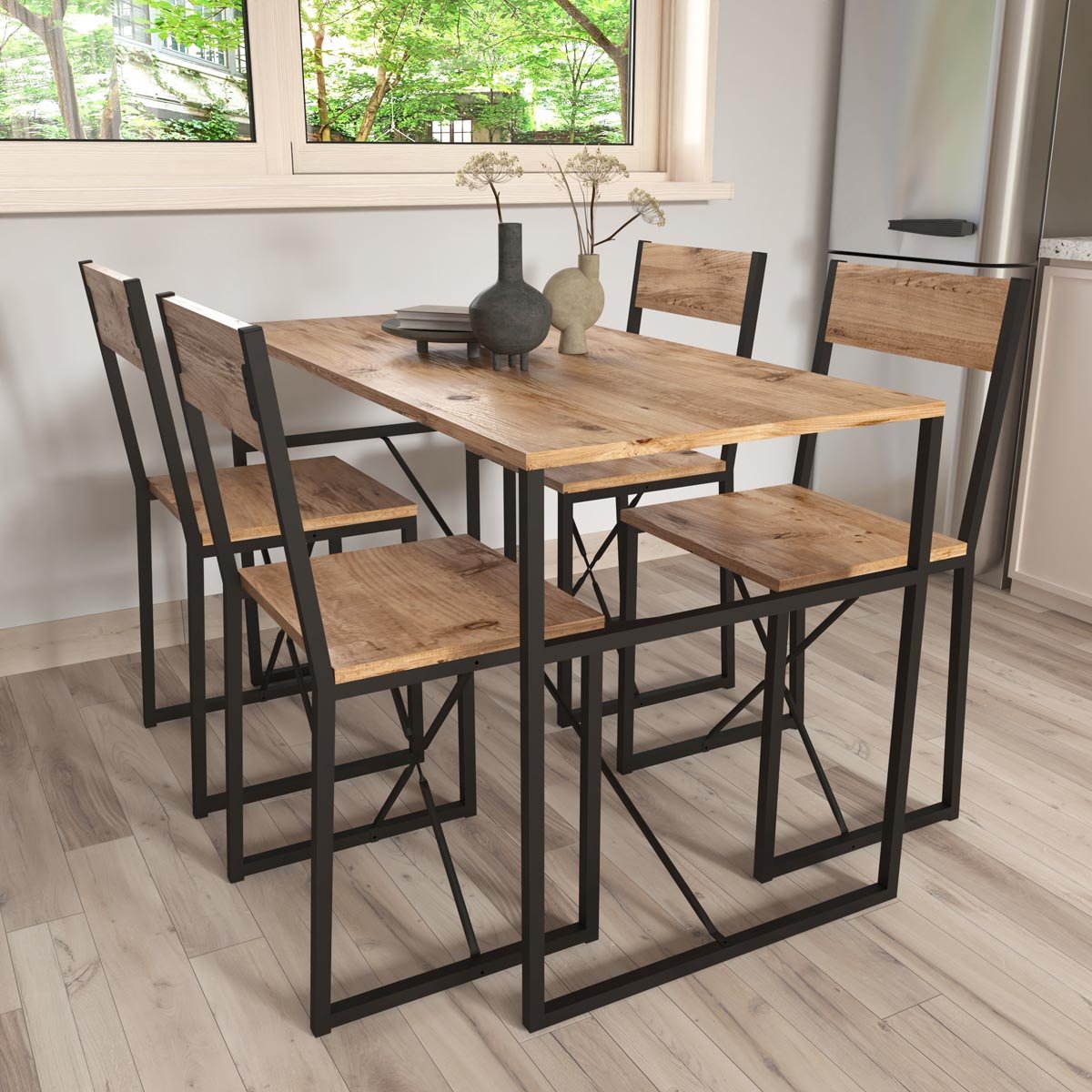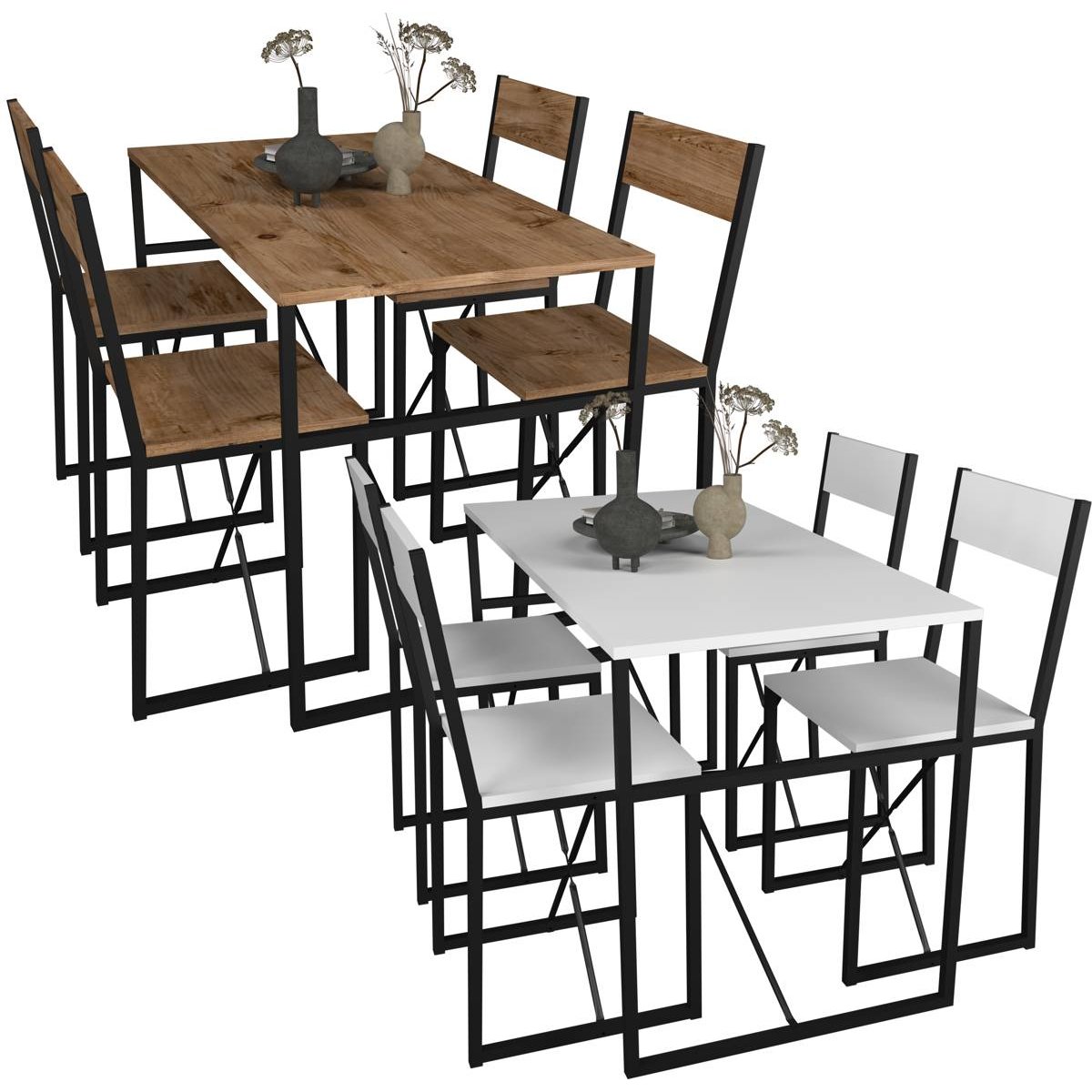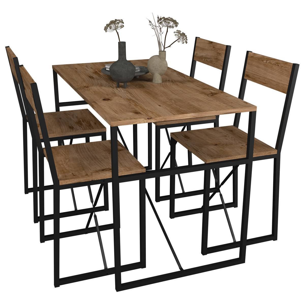 Hlavní vlastnosti: - Rozměry stolu cca v. 72 x š. 120 x h. 60 cm - Rozměry židlí cca v. 85 x š. 40 x h. 43 cm - Čtyři židle lze zasunout pod stůl pro úsporu místa - Úspora místa do každé jídelny - Kvalitní a stabilní zpracování v industriálním stylu - 1 stůl a 4 židle Sedací souprava „Insasi L“ šetří místo v každé jídelně. Nábytková sestava je nejen poutavým doplňkem, ale také velmi chytrým a funkčním kusem nábytku, protože židle lze pro úsporu místa uložit pod stůl. Od 70. let 20. století se VCM specializuje na design, výrobu a distribuci nábytku s férovým poměrem cena/výkon a již zkrášlila miliony domácností.Doplňkové parametry