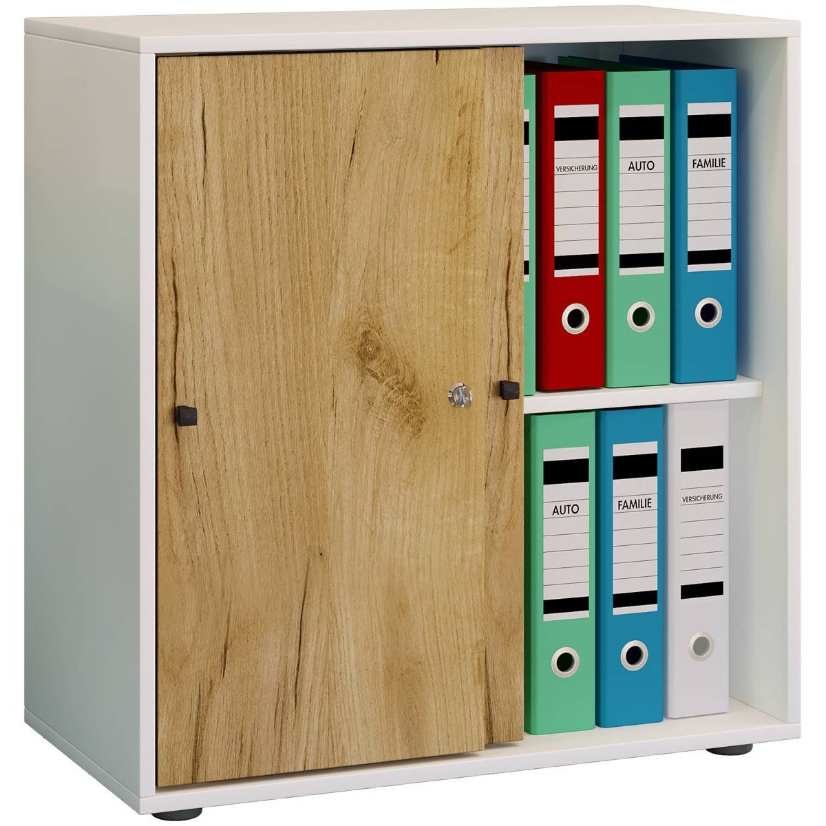 Hlavní vlastnosti: - K dispozici v různých barvách - Kování z vysoce kvalitního kovu - Jedna variabilní police za dvěma posuvnými dveřmi - Dvě police pro 14 složek - Dvoje posuvné dveře uzamykatelné - Rozměry výrobku cca Š. 70 x V. 74 x H. 40 cm Kancelářská skříň VCM „Lona L“ má dvoje posuvné dveře, jednu variabilní polici a dostatek prostoru pro 14 složek a další potřeby. Korpus je vyroben z reprodukce struktury dřeva a má stabilní zadní desku. Můžete ji kombinovat s dalším nábytkem ze série „VCM Lona“.Doplňkové parametry