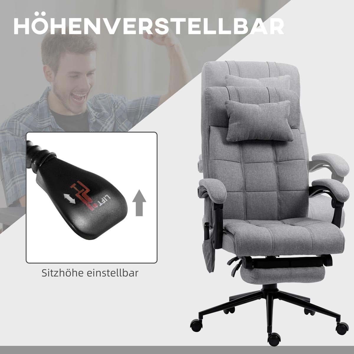 Opěradlo je polohovatelné až do 155° a doplněné výsuvnou opěrkou nohou pro maximální relaxaci. Masážní systém se šesti body, pěti režimy a vyhříváním v bederní oblasti pomáhá uvolnit napětí během pracovního dne. Praktické kolečka umožňují snadný pohyb po místnosti bez nutnosti vstávání.