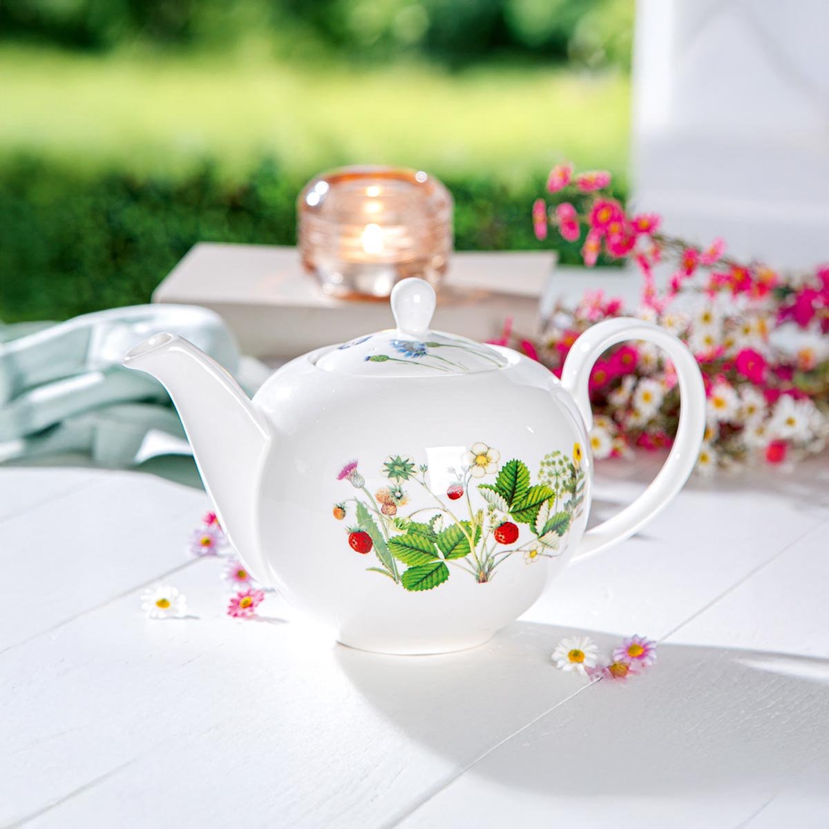 Stylová konvička na čaj se skvěle kombinuje s hrnkem, cukřenkou, mlékovkou i dalšími doplňky kolekce Divoké květy a vytváří harmonický celek na vašem stole.