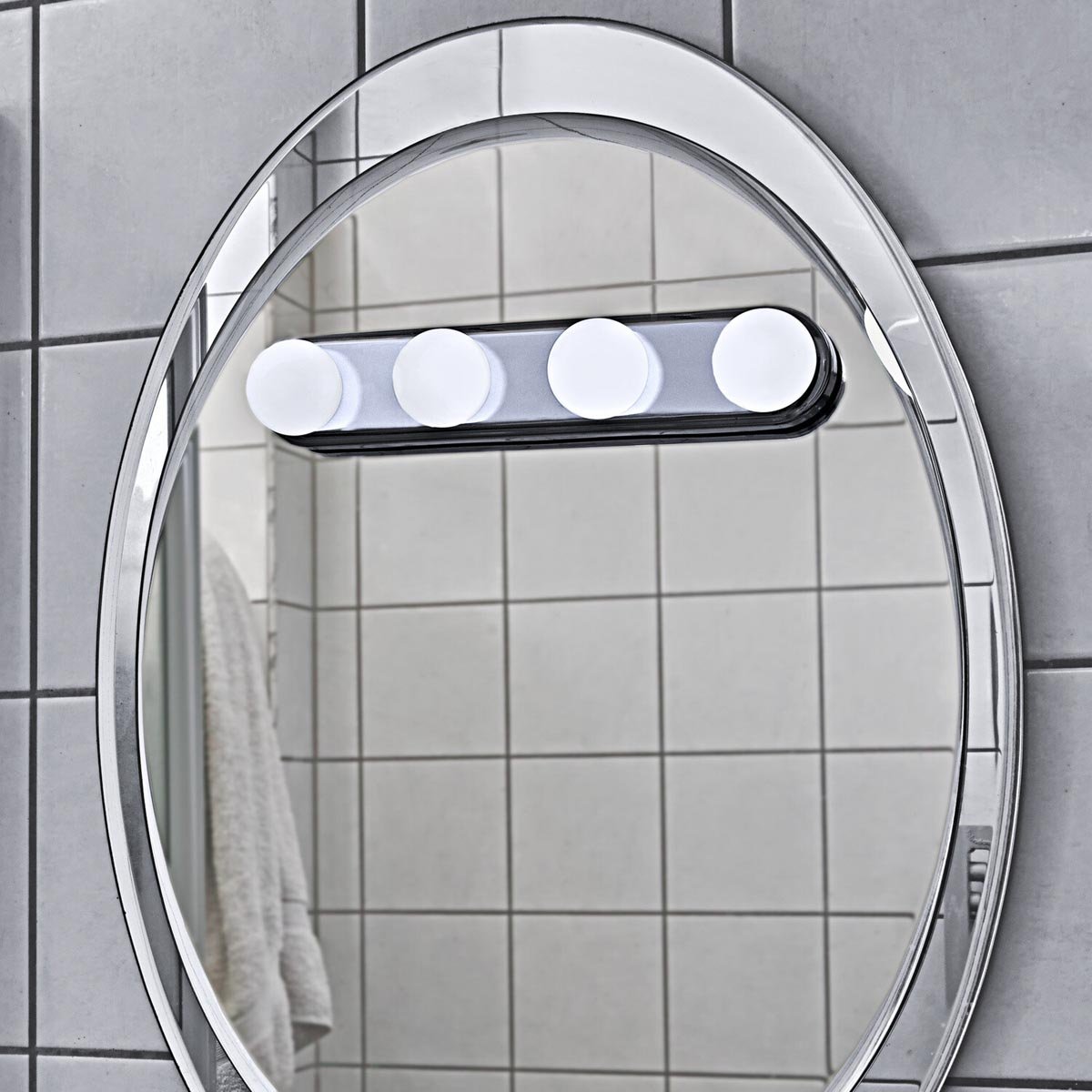 Měkké, neoslňující, přitom jasné jako den: přirozené světlo v koupelně! Je to právětato LED lampa, kterou profesionální vizážisté doporučují pro Vaše každodenní líčení. Snadné připevnění pomocí lepicích podložek. Provoz na 4 tužkové baterie AA (nejsou součástí). LED. Přirozené denní světlo. Ideální pro make-up. Včetně lepicích podložek na zrcadla, dlaždice atd..