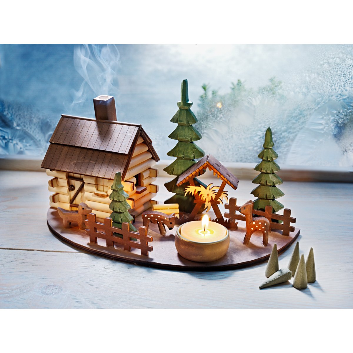 Kouřící srub: detailně propracované, kompletně ze dřeva, odnímatelný srub – uvnitř s montáží pro vonné kužely (kadidlo), vůně/kouř stoupající z komína vzhůru, včetně svícnu na svíčky (svíčky nejsou součástí balení), 30 františků (kadidel) s vůní zeleného čaje.