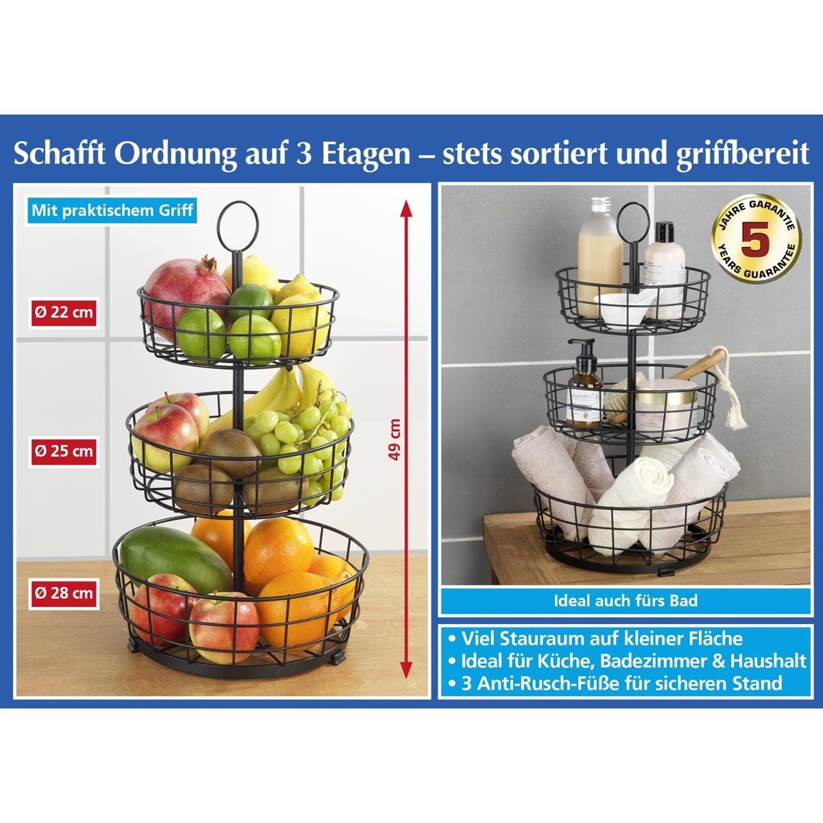 Pevná kovová konstrukce zajišťuje stabilitu a dlouhou životnost, zatímco otevřený design umožňuje dobré proudění vzduchu, což je ideální pro skladování ovoce a zeleniny. Vícepatrové uspořádání zároveň šetří místo na kuchyňské lince a udržuje potraviny přehledně uspořádané.