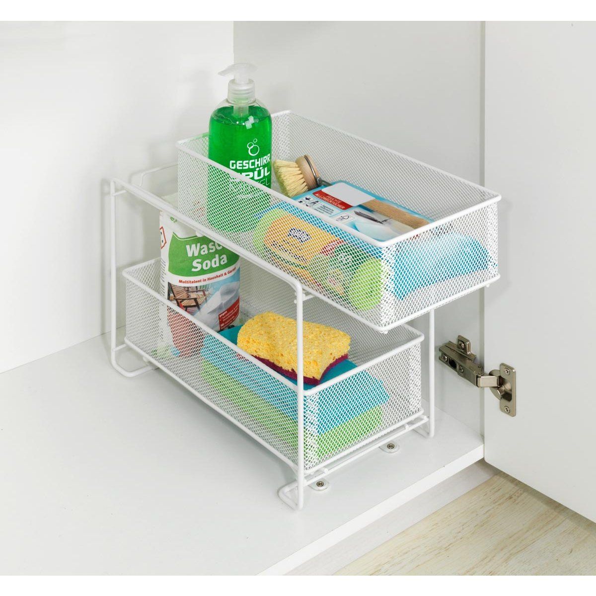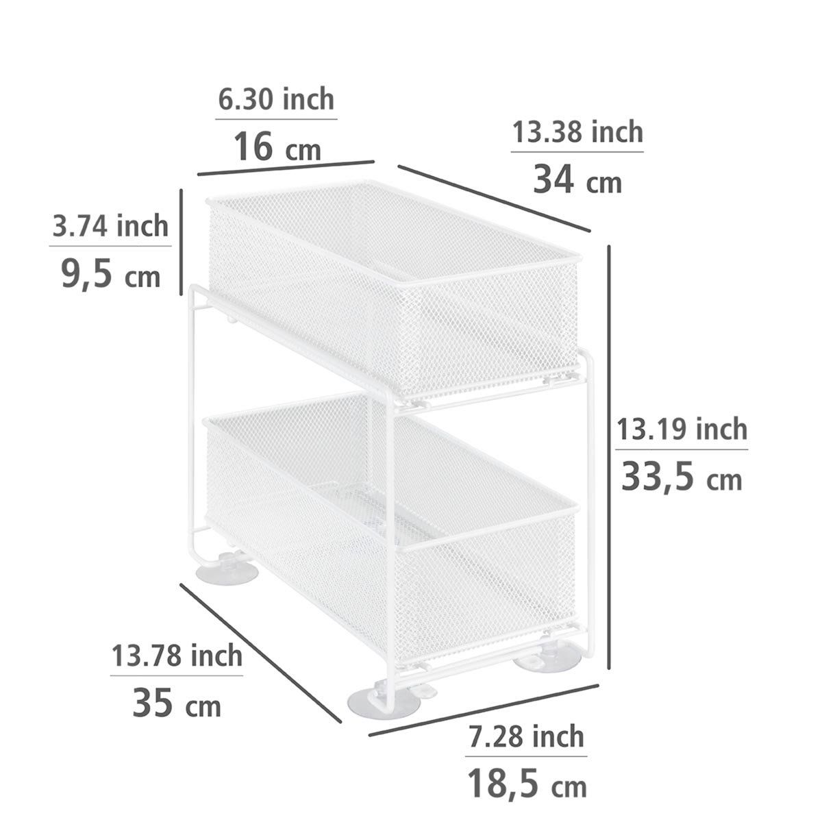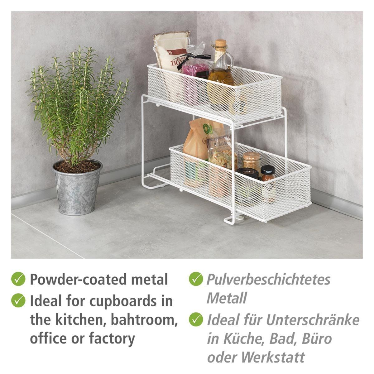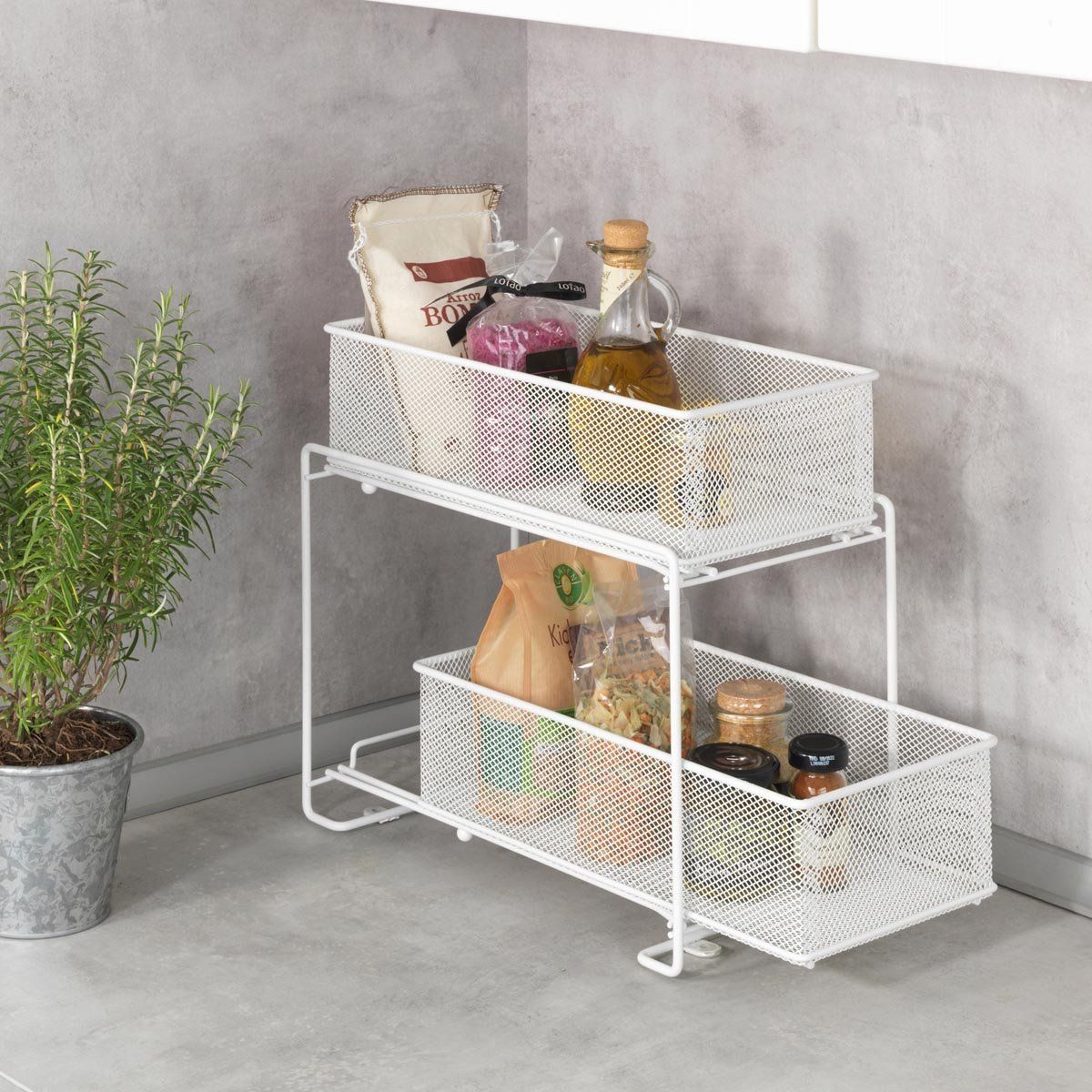 Praktický kovový organizér do kuchyně se zásuvkami vám pomůže lépe využít prostor ve skříňkách a udržet domácnost přehledně uspořádanou. Díky dvěma úrovním s vysouvacími košíky nabízí snadný přístup ke všem uloženým věcem a je ideální jako organizér do kuchyně i organizér pod dřez. Skvěle poslouží pro potraviny, koření, čisticí prostředky nebo kuchyňské doplňky. Stabilní kovová konstrukce zajišťuje dlouhou životnost a moderní vzhled.