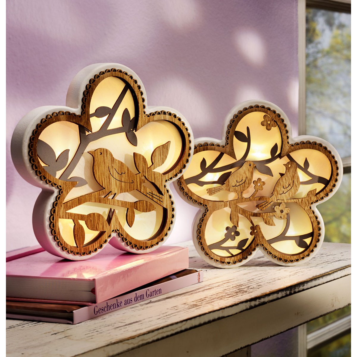 Kouzelné květiny zaujmou na první pohled. Přední strana je zdobena siluetami ptáků a větví, lemování je zpracováno jako jemná krajka. Po zapnutí integrovaného LED světla se rozzáří okouzlující přírodní scenérie v teplém světle.