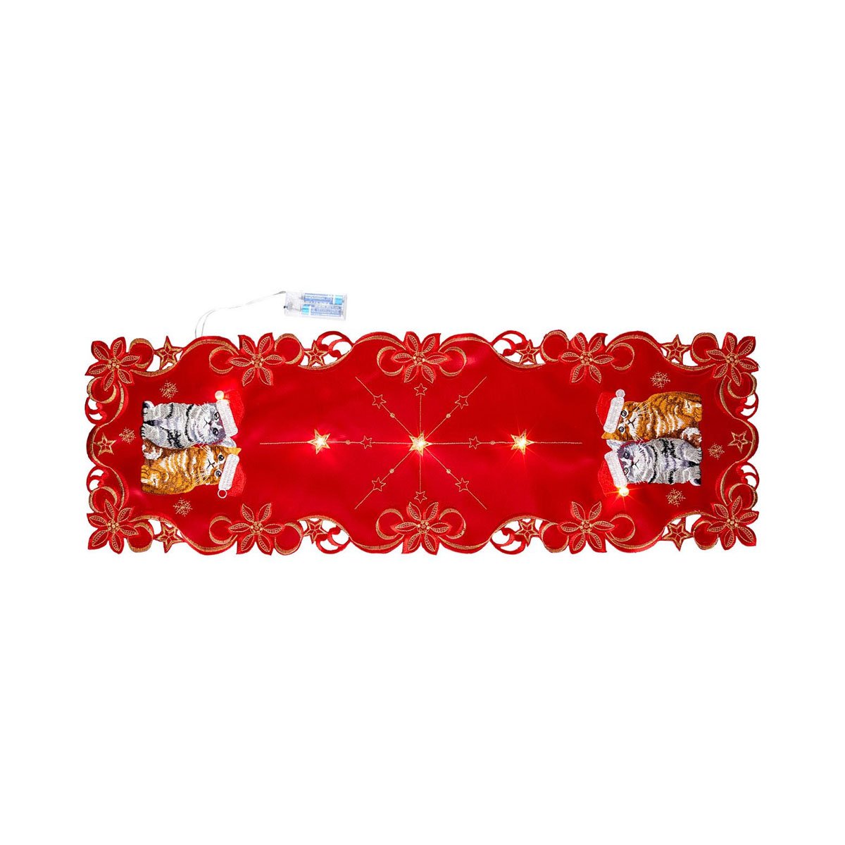 Zdobený vánoční LED ubrus s roztomilými koťátky jako hlavním motivem. 8 LED diod lze snadno odstranit pomocí suchého zipu. Ideální v kombinaci s potahem na polštář.