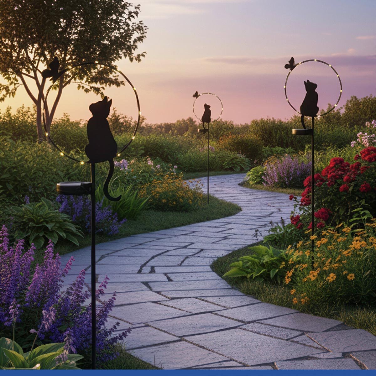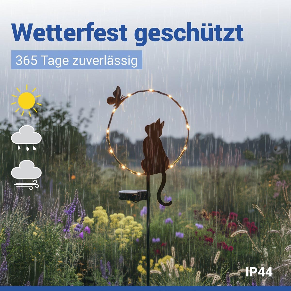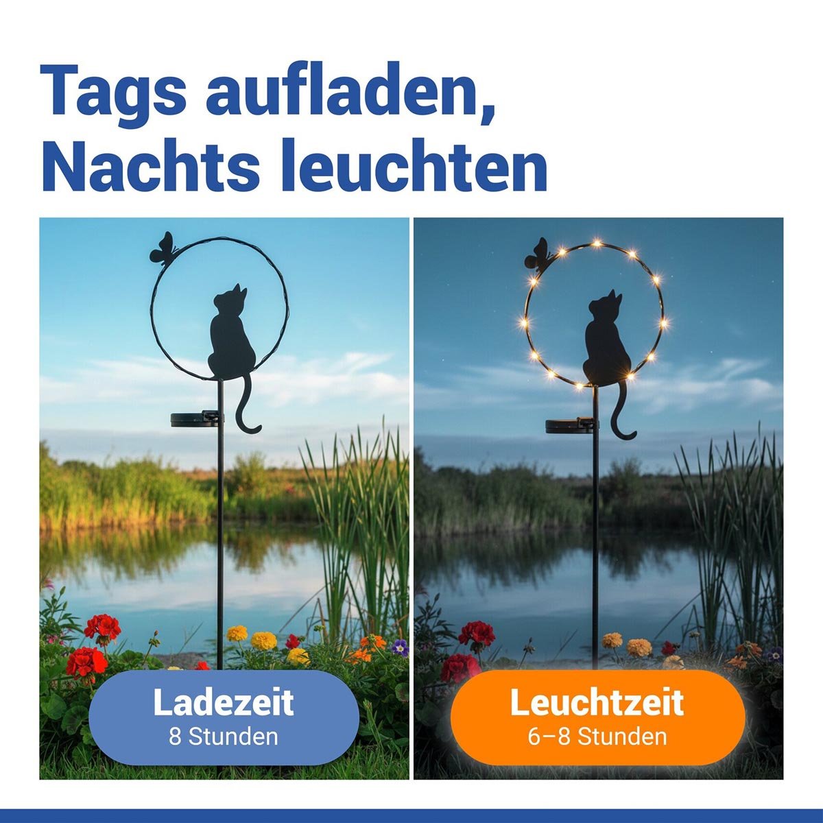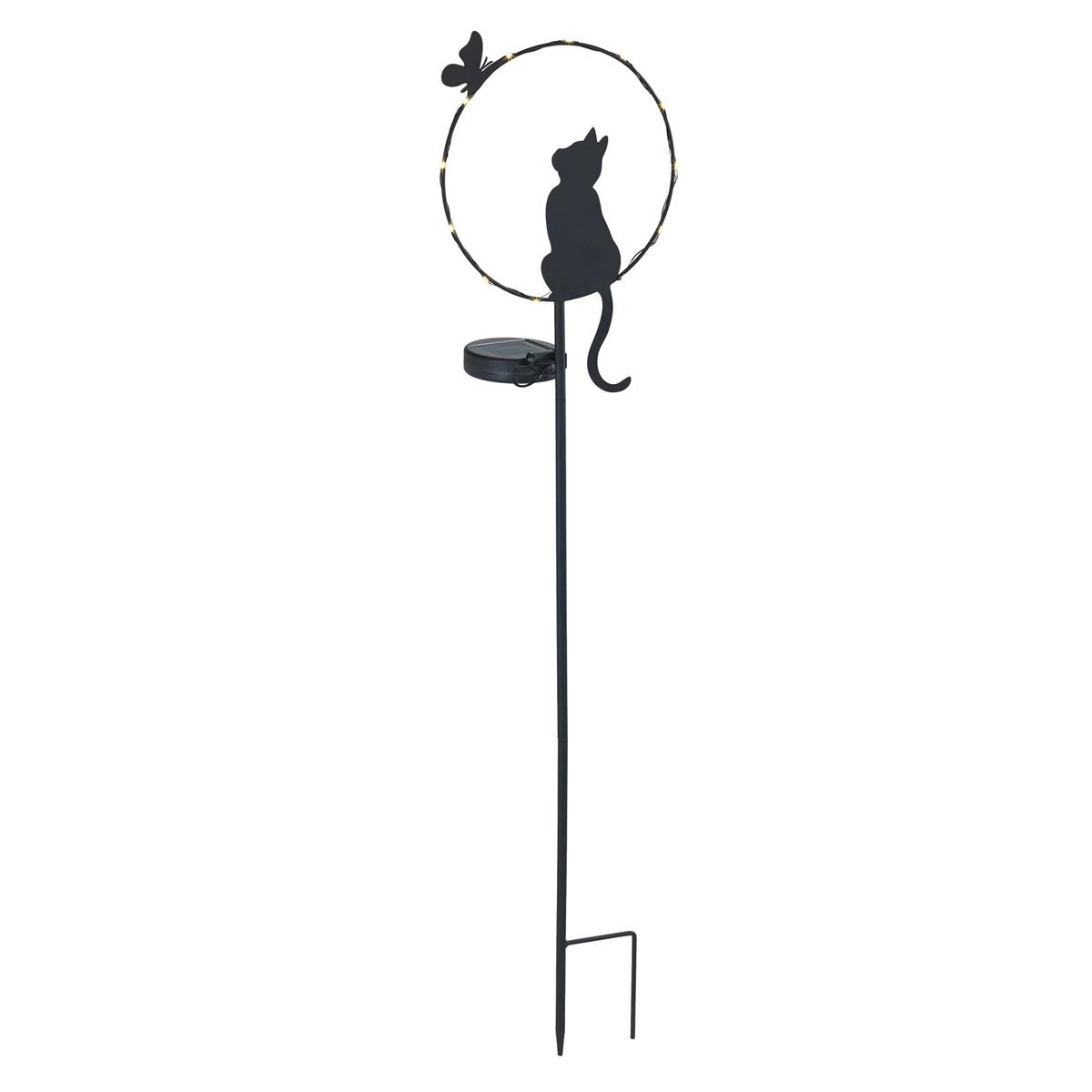 Tento originální LED zahradní zápich s motivem kočky a motýla vytváří působivou světelnou atmosféru ve vašem exteriéru. Po setmění se automaticky aktivuje a zvýrazní kočičí siluetu pomocí kulatého LED prstence, který dodá zahradě jemný a teplý světelný efekt.
