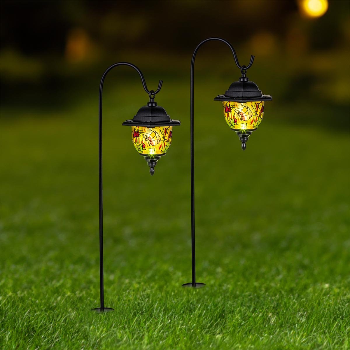 Tato působivá zahradní světla vytvářejí nádherné obrazy díky barevnému motivu, který dodá vaší zahradě jedinečný nádech. Lucerny jsou odolné proti povětrnostním vlivům, takže budou zářit i při nepříznivém počasí. Lucerny automaticky začnou svítit po setmění a nabité jsou schopné osvětlovat vaše okolí až 8 hodin.
