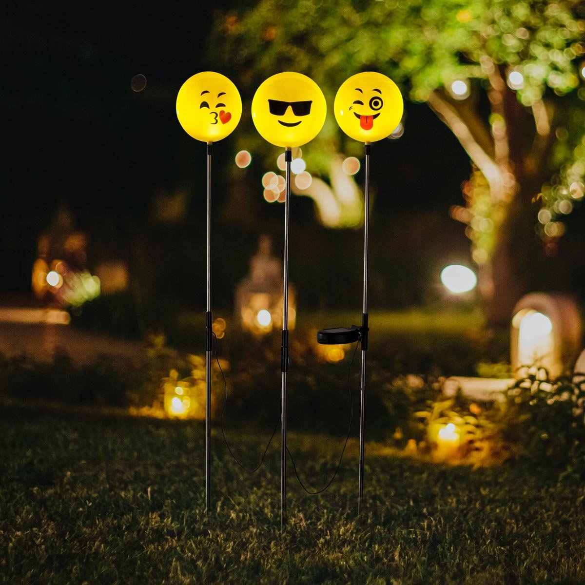 Veselá sada 3 solárních zápichů do zahrady s různými smajlíky zdobí ve dne i večer. Přes den se nabíjí společným solárním panelem a v noci září 3mi LED diodami. Zápichy lze umístit cca 60 cm od sebe. S vypínačem a zemním hrotem.