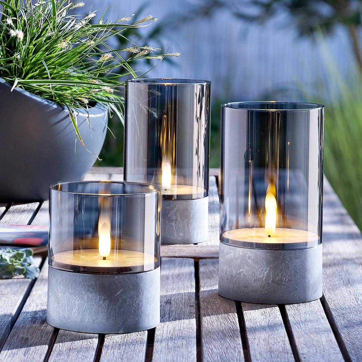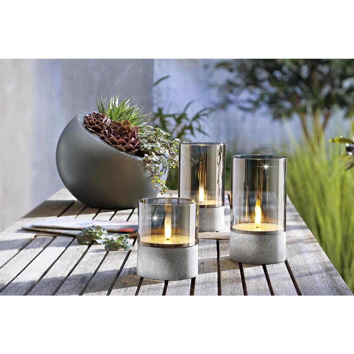 Spodní část svícnu z litého kamene v módním betonovém vzhledu je doplněna válci z ušlechtilého kouřově šedého skla s decentním duhovým efektem. Díky provozu na baterie, můžete svícny umístit kamkoliv chcete, ať už jednotlivě, nebo jako sadu.