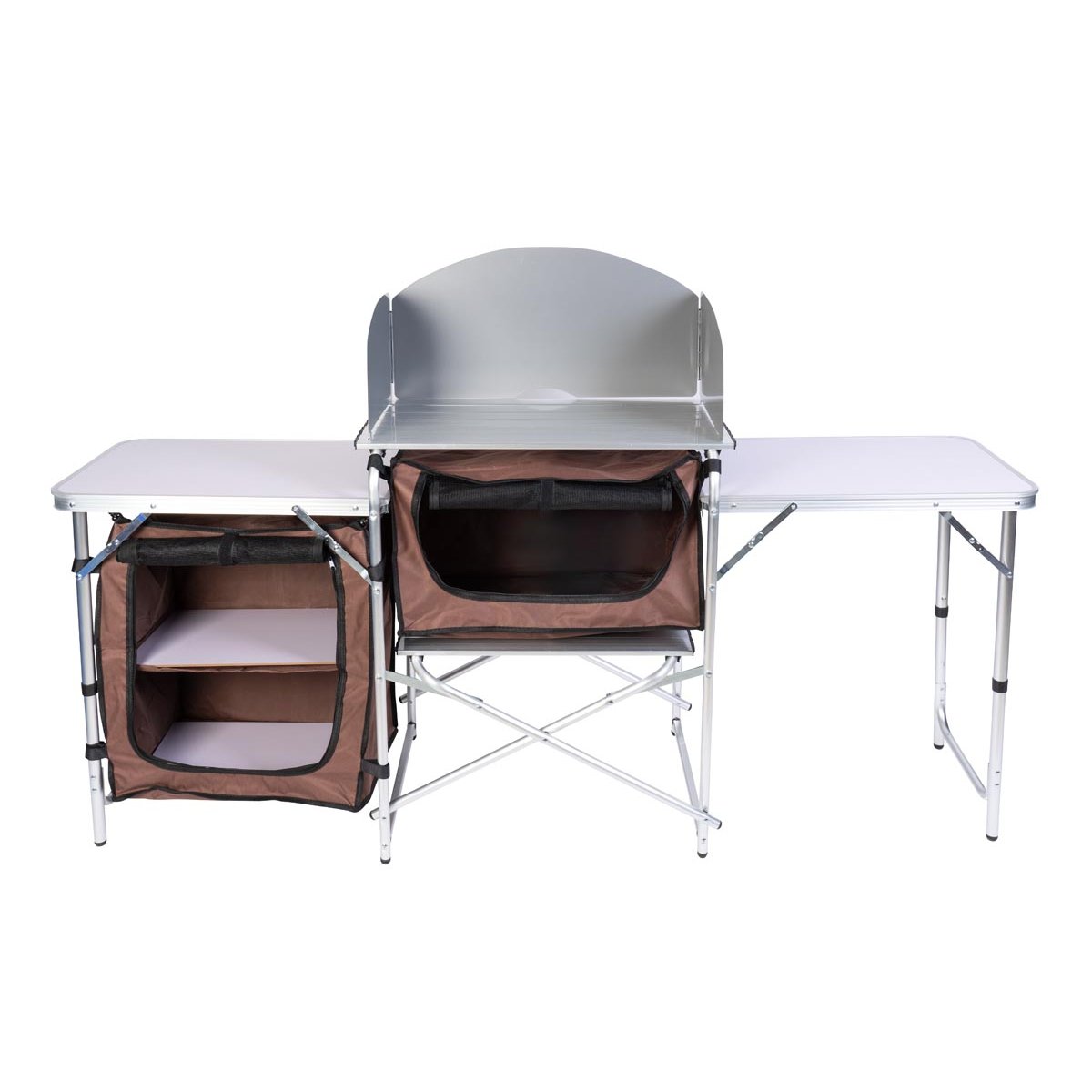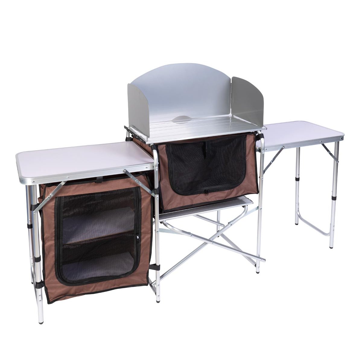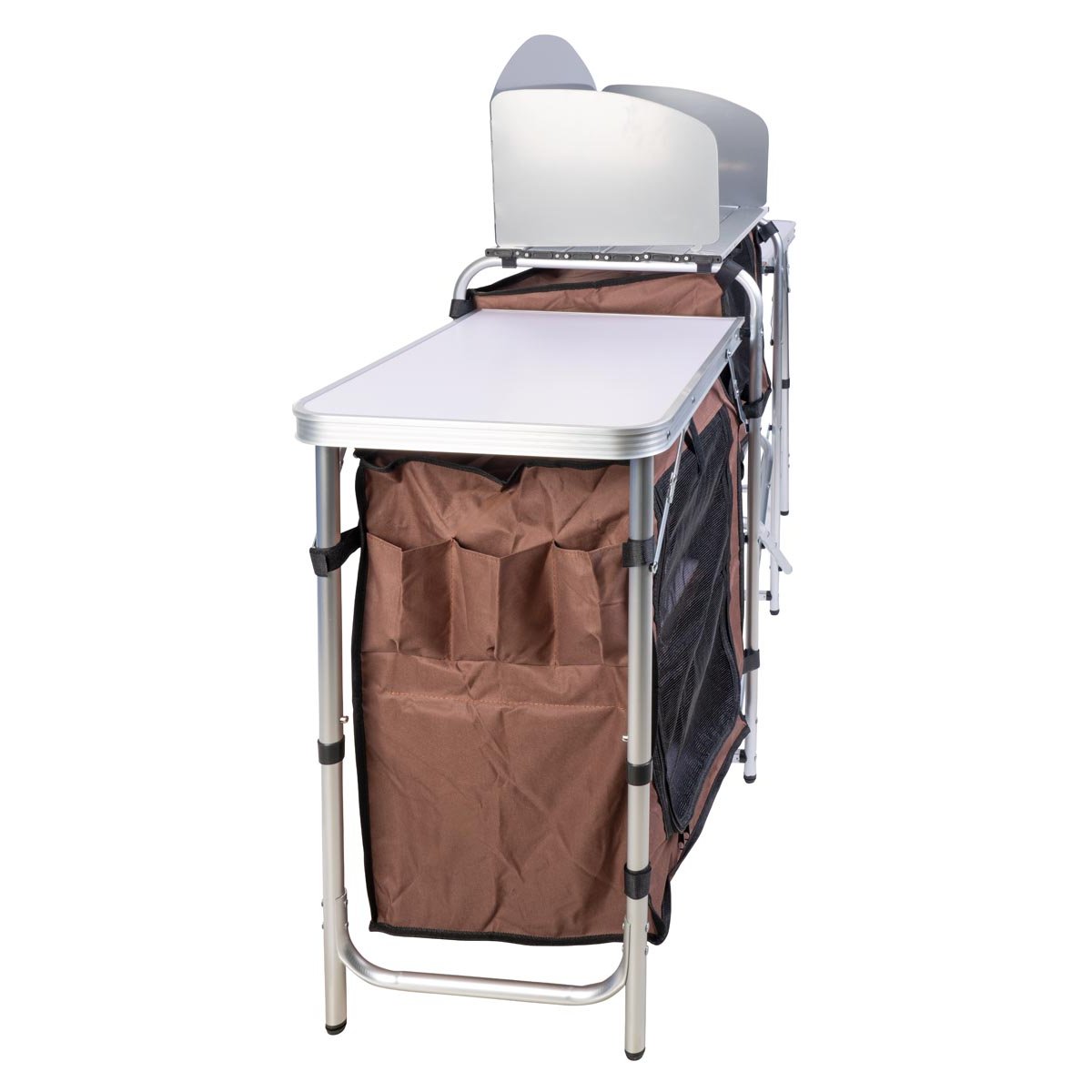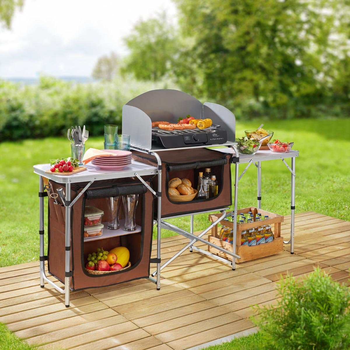 Tato mobilní kuchyně je ideálním řešením pro vaření pod širým nebem – při grilování, kempování i pohodovém venkovním posezení na zahradě či terase. Během několika vteřin ji postavíte a získáte praktické zázemí s větrem chráněnou plochou pro vařič nebo gril, dvěma postranními stolky a uzavíratelnými úložnými prostory na kuchyňské náčiní.