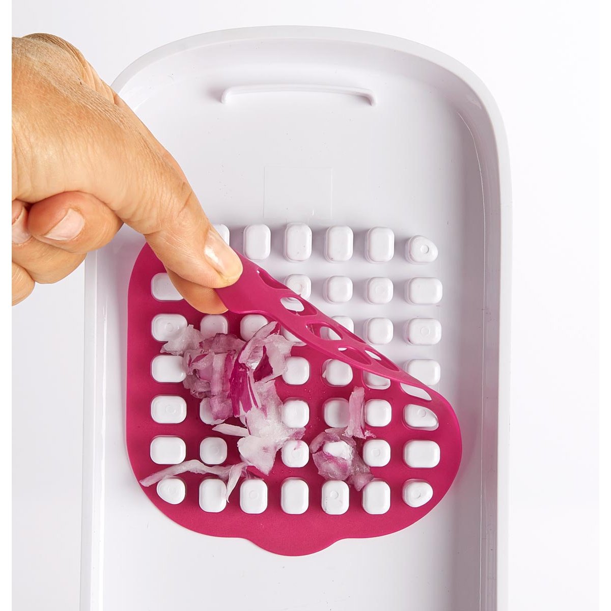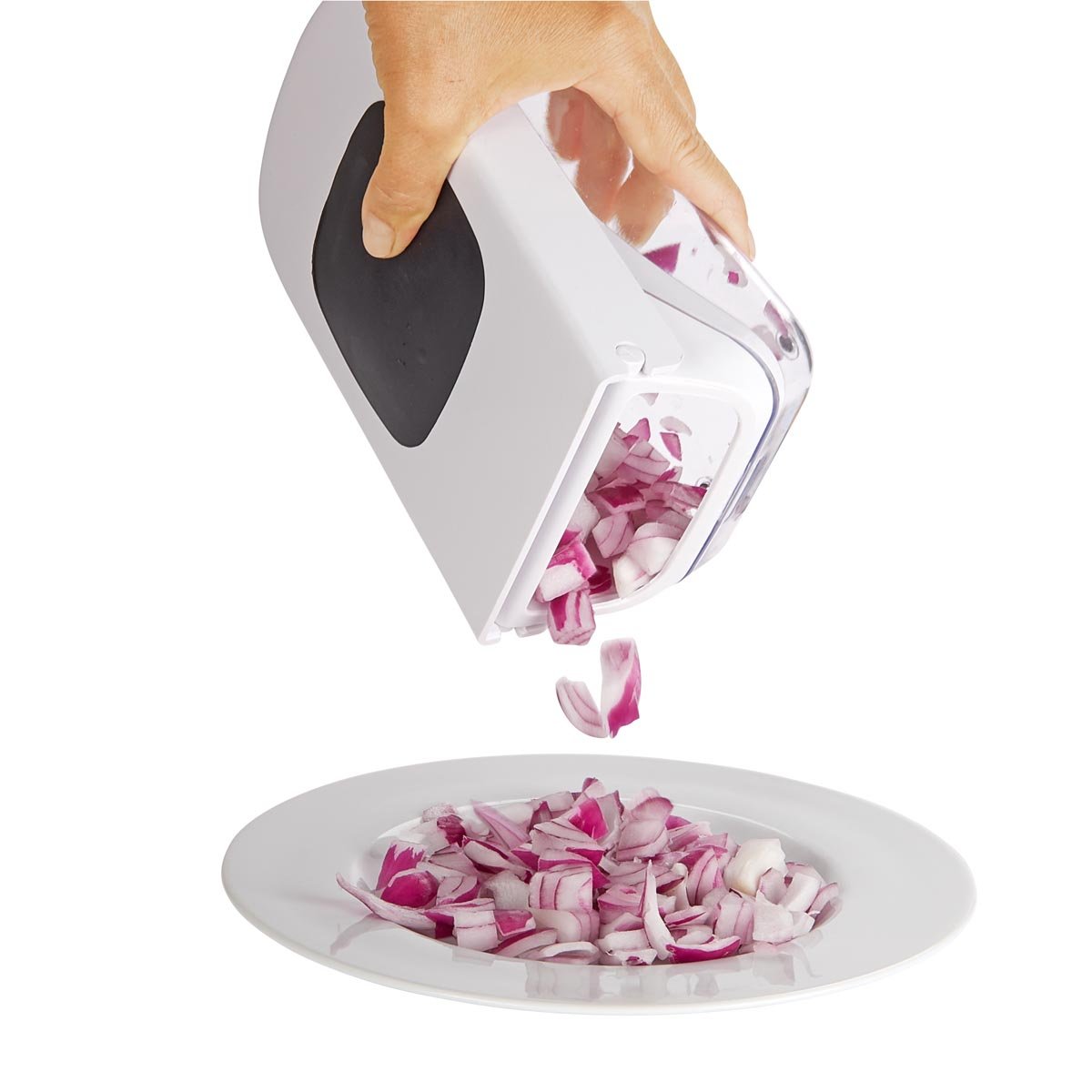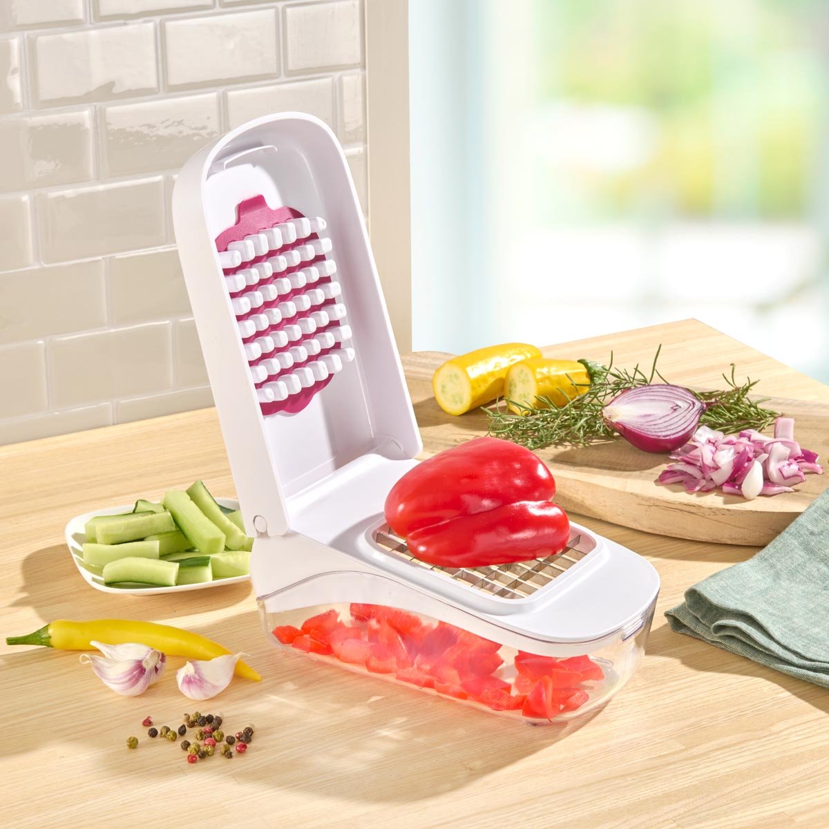 Rovnoměrné kostky zeleniny během chvilky? K tomu je ideální tento geniální kráječ zeleniny na kostičky! Jediným pohybem ruky promění okurky, papriky a další zeleninu na rovnoměrné kousky, které můžete díky sběrné nádobě okamžitě zpracovat. Díky odstraňovací podložce snadno odstraníte všechny hrubé zbytky.