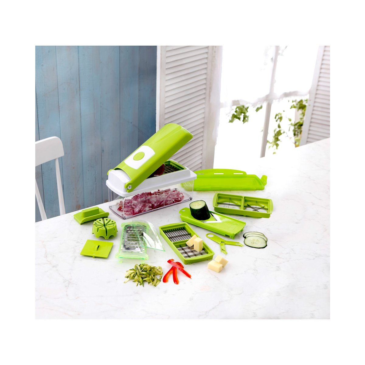 Multikráječ obsahuje 5 různých krájecích vložek s 11 krájecími variantami – kostičky, hranolky, kolečka, čtvrtky a osminky v různých tloušťkách.