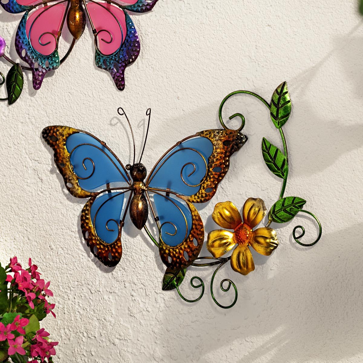 Dekorativní motýl se na stěně skutečně vyjímá a do interiéru přináší krásné barvy. Po setmění křídla jemně září díky použitým fluorescenčním materiálům. Materiál: kov, plast.