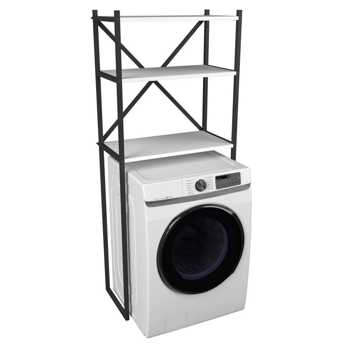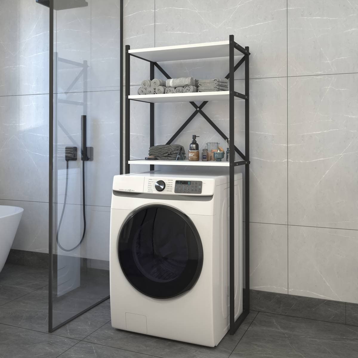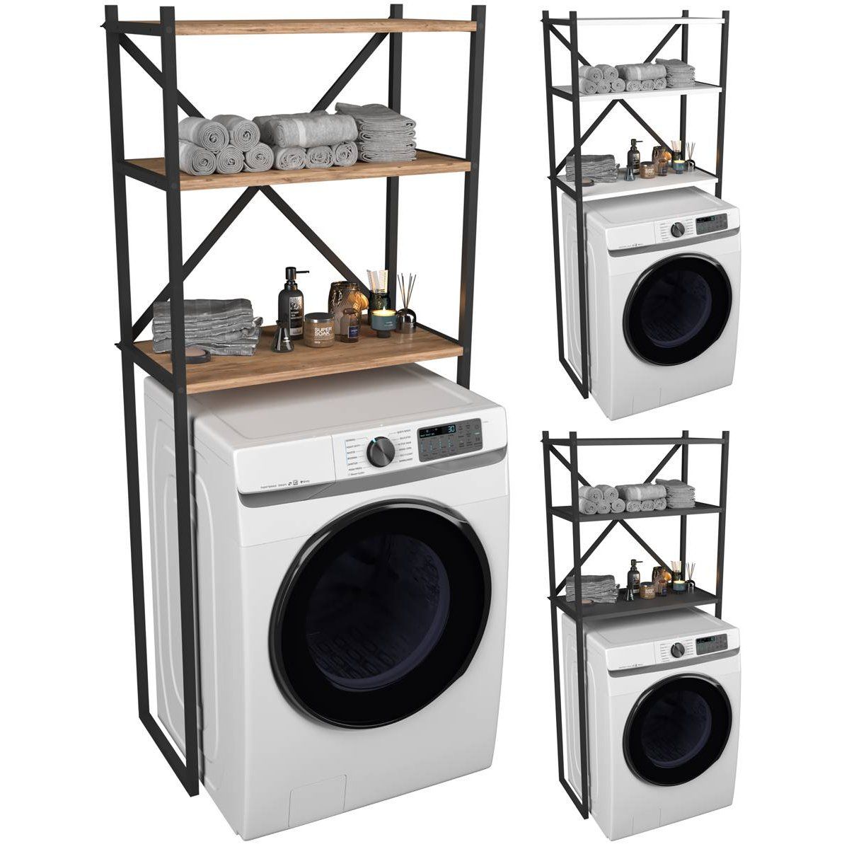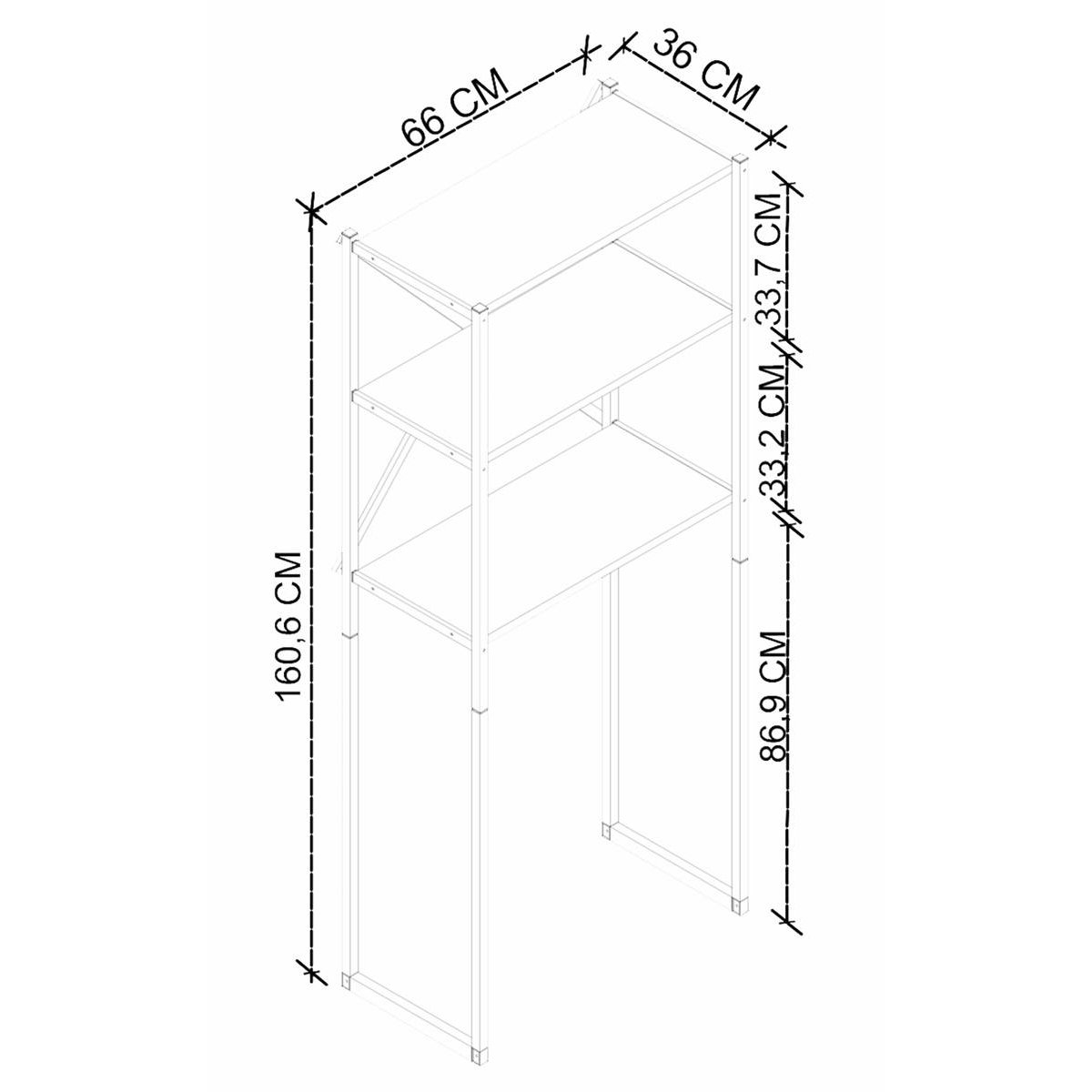 Tento víceúčelový policový regál nad pračku nabízí díky třem prostorným policím dostatek úložného prostoru pro ručníky, čisticí prostředky i další koupelnové potřeby. Díky nadčasovému designu se skvěle hodí jako praktický nábytek do koupelny, který efektivně využije prostor nad pračkou a pomůže udržet pořádek i v menších místnostech.
