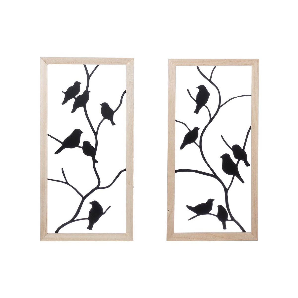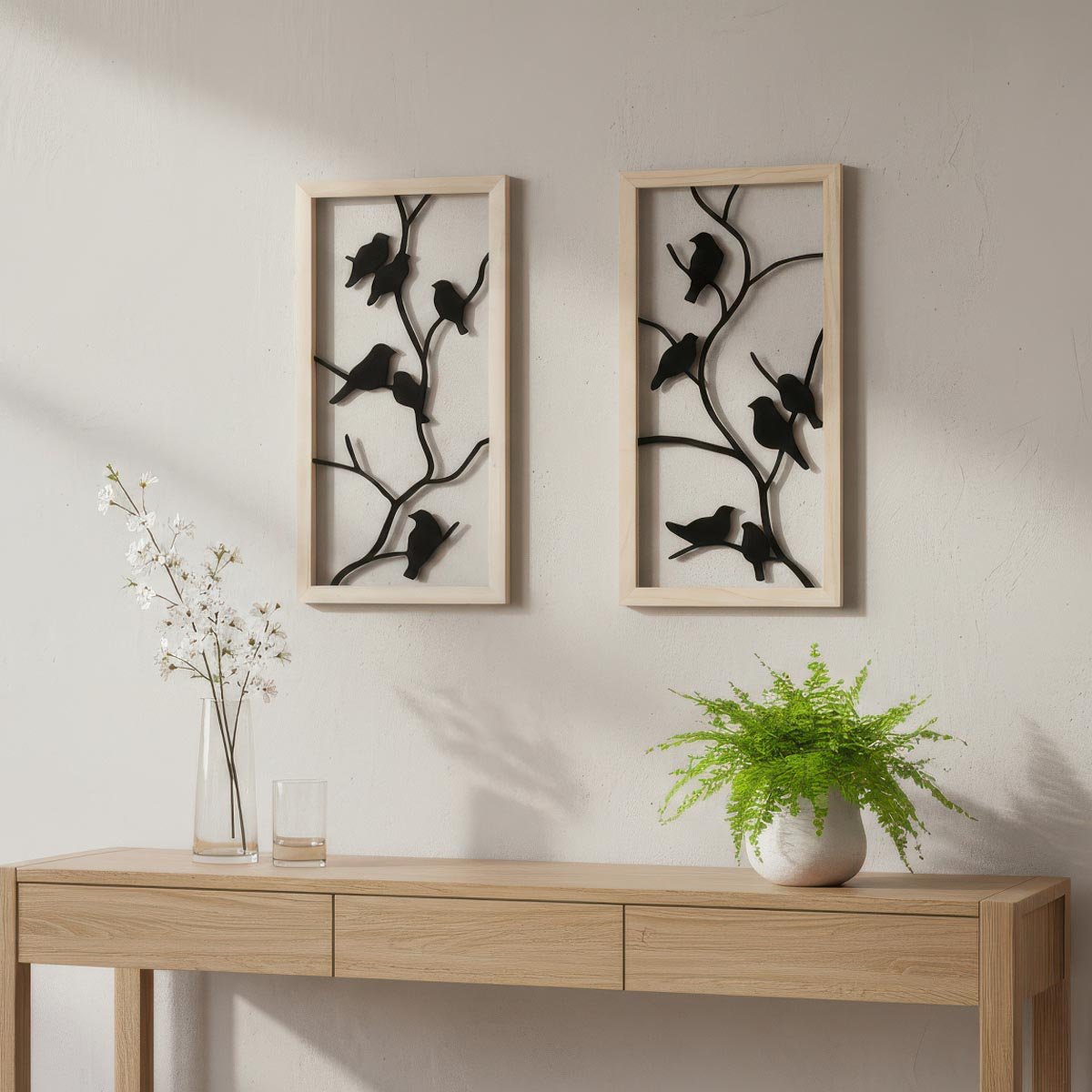 Elegantní dekorace na zeď s motivem ptáčků na větvích vnese do interiéru klid, lehkost a přírodní atmosféru. Černé kovové siluety krásně kontrastují se světlým dřevěným rámem a vytvářejí moderní, ale zároveň útulný vzhled.