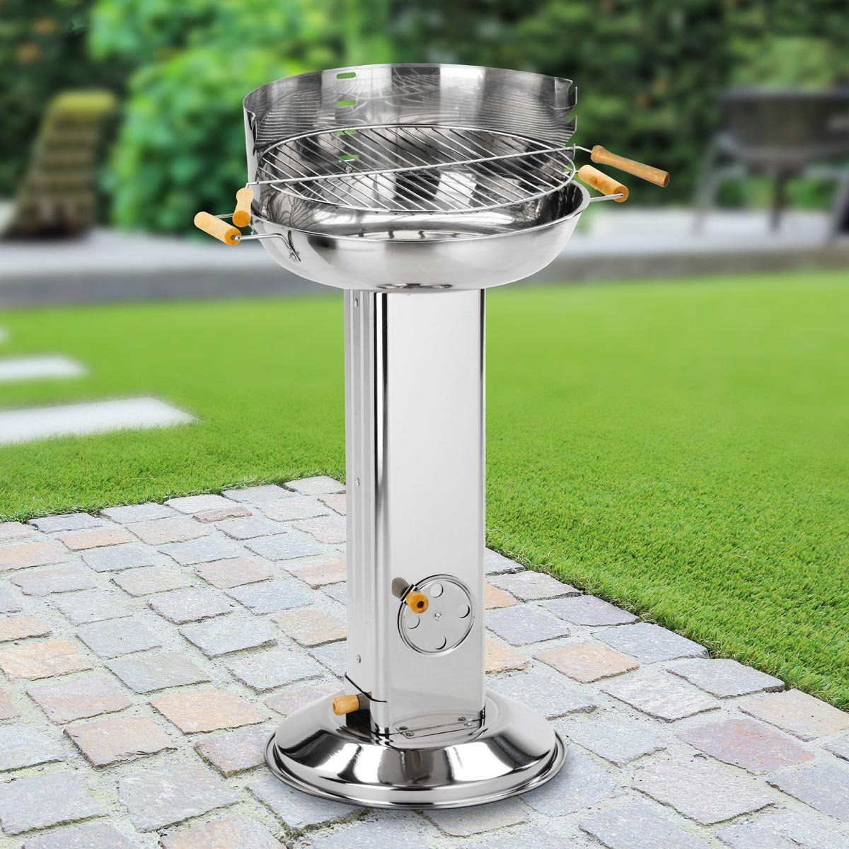Zahradní gril z nerezové oceli o výšce 83 cm má grilovací rošt s dřevěnými rukojeťmi. Při grilování si tak můžete zvolit výšku roštu mezi čtyřmi úrovněmi. Perfektní gril na dřevěné uhlí pro vaši zahradu, terasu nebo kempování.
