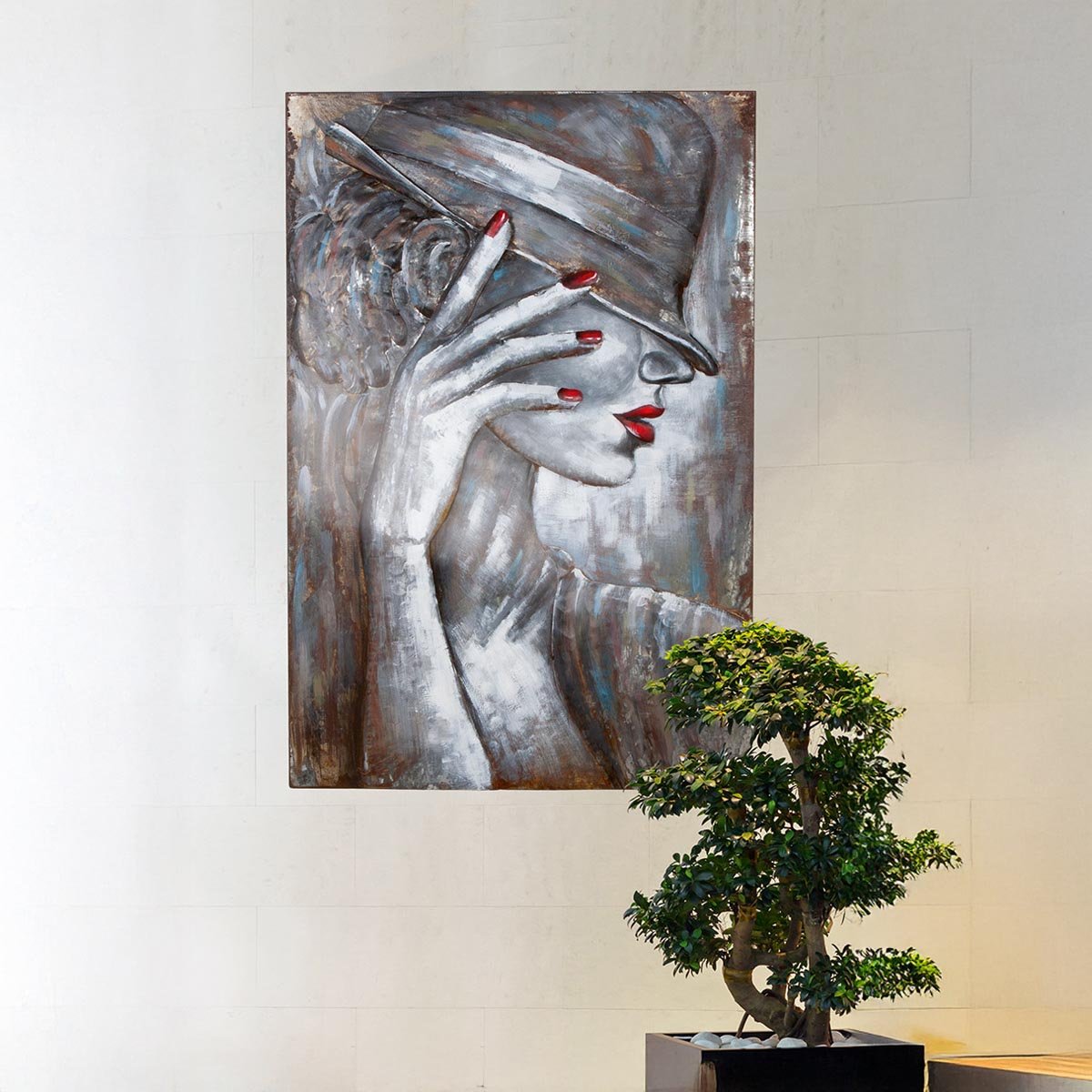Obdélníková kovová dekorace je laděna do elegantní bílé barvy, doplněné o stylové hnědé a červené akcenty. Tyto kontrastní tóny oživují povrch a zvýrazňují umělecký charakter celého díla. Díky svým velkorysým rozměrům se jedná o dominantní dekoraci na zeď, která skvěle vynikne v moderních interiérech.